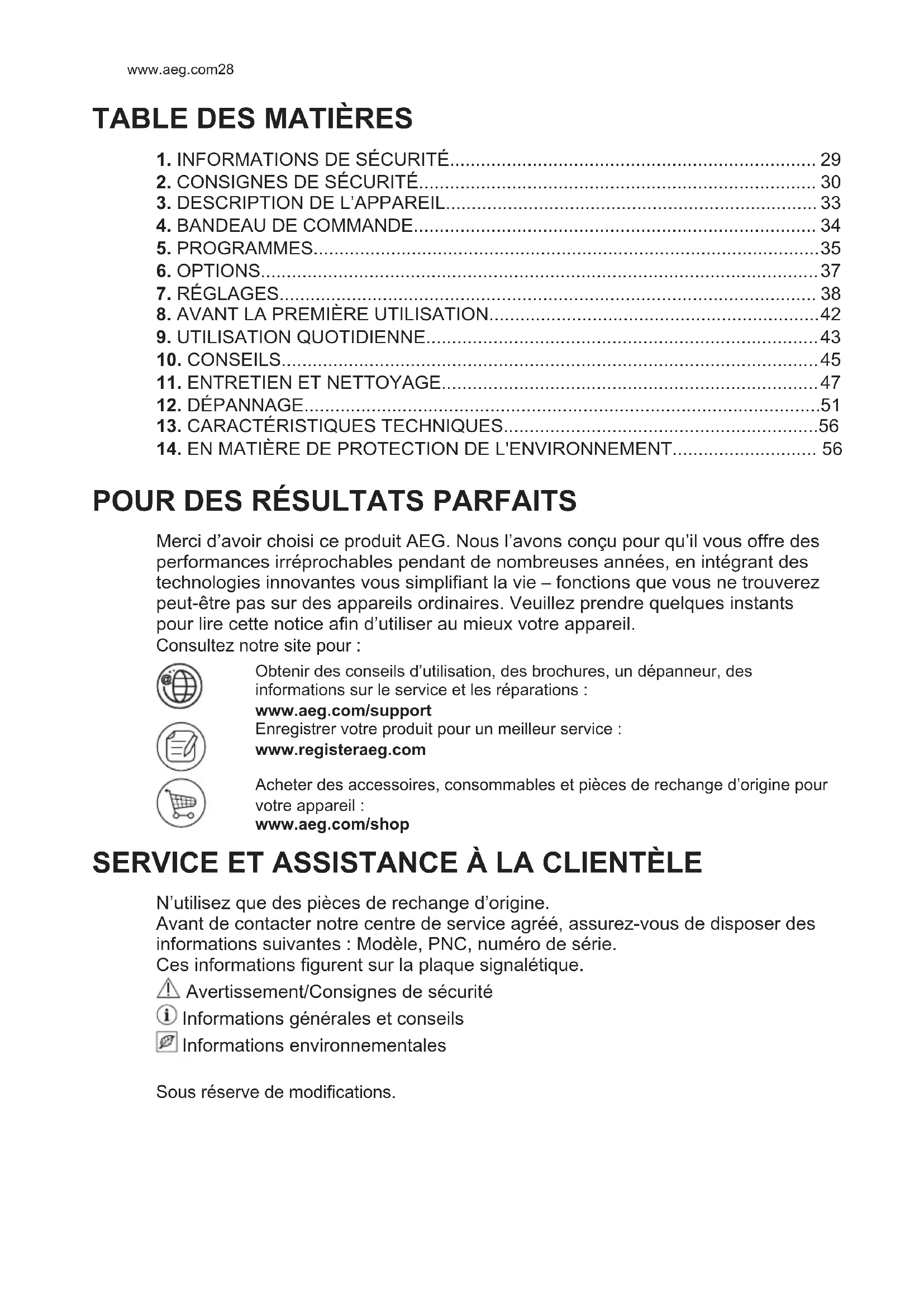 Merci d’avoir choisi ce produit AEG. Nous l’avons conçu pour qu’il vous offre des performances irréprochables pendant de nombreuses années, en intégrant des technologies innovantes vous simplifiant la vie – fonctions que vous ne trouverez peut-être pas sur des appareils ordinaires. Veuillez prendre quelques instants pour lire cette notice afin d’utiliser au mieux votre appareil. Consultez notre site pour : Obtenir des conseils d’utilisation, des brochures, un dépanneur, des informations sur le service et les réparations : www.aeg.com/support Enregistrer votre produit pour un meilleur service : www.registeraeg.com Acheter des accessoires, consommables et pièces de rechange d’origine pour votre appareil : www.aeg.com/shop