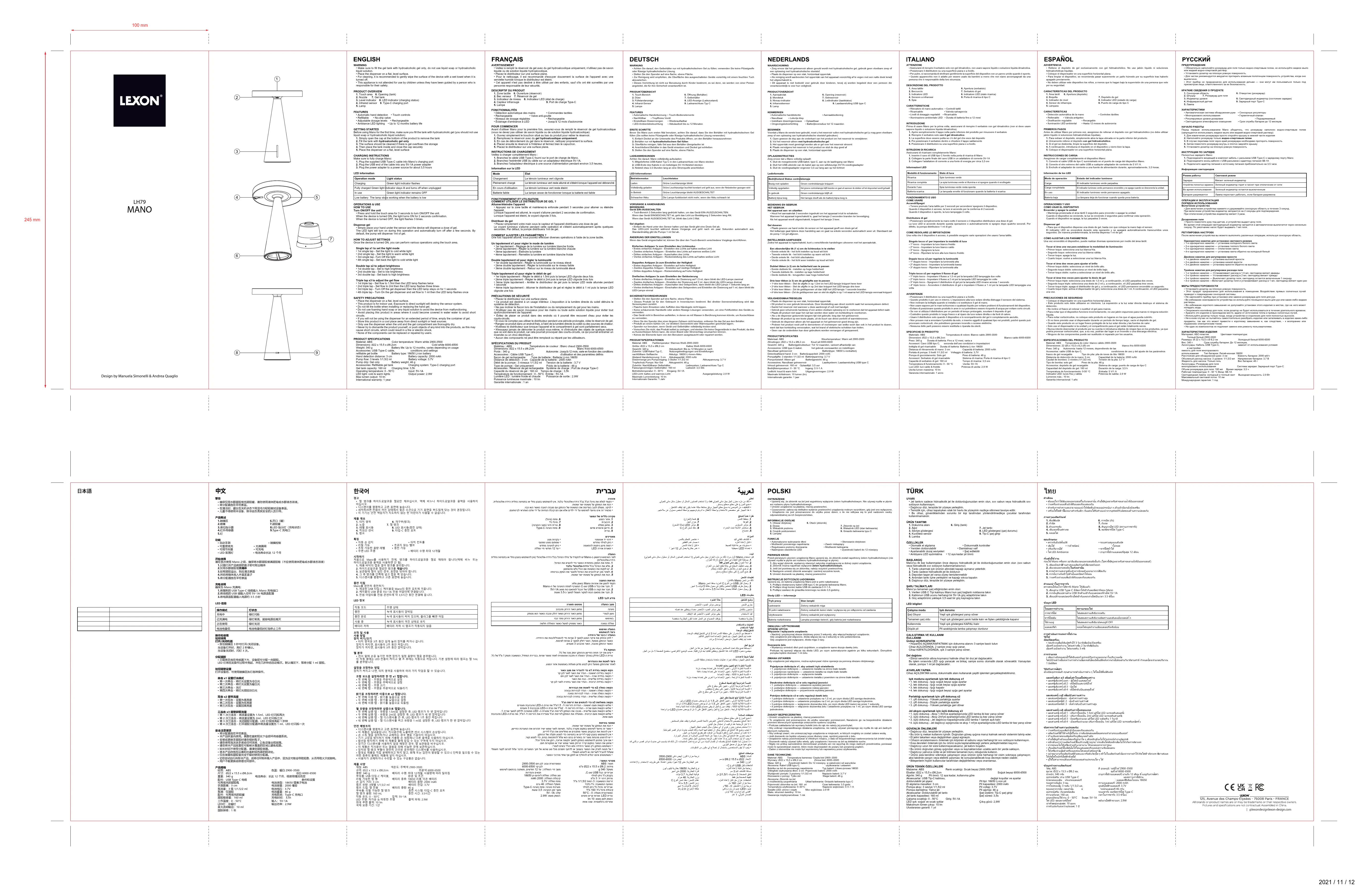 2021 / 11 / 12 @lexondesignlexon-design.com MANO LH79 WARNING• Make sure to fill the gel tank with hydroalcoholic gel only, do not use liquid soap or hydroalcoholic liquid solution.• Place the dispenser on a flat, level surface.• For cleaning, it is recommended to gently wipe the surface of the device with a wet towel when it is turned off.• This appliance is not attended for use by children unless they have been guided by a person who is responsible for their safety.PRODUCT OVERVIEW1. Touch area 6. Opening (tank)2. Nozzle 7. Gel tank3. Level indicator 8. LED indicator (charging status)4. Infrared sensor 9. Type-C charging port5. LampFEATURES• Automatic hand detection • Touch controls• Refillable • No-drip valve• Adjustable dosage levels • Rechargeable• Ambiance LED lighting • Up to 12 months battery life GETTING STARTEDBefore using Mano for the first time, make sure you fill the tank with hydroalcoholic gel (you should not use liquid soap or hydroalcoholic liquid solution)1. Simply open the cap at the bottom of the product to remove the tank2. Fill the tank with hydroalcoholic gel only3. The surface should be cleaned if there is gel overflows the storage4. Then place the tank inside and close the cap securely5. Place the dispenser on a flat, level surfaceCHARGING INSTRUCTIONSMake sure to fully charge Mano: 1. Plug the supplied USB Type-C cable into Mano’s charging port2. Plug the USB end of the cable into any 5V-1A power adapter3. Plug the power adapter to a power source for about 3,5 hoursLED informationAVERTISSEMENT• Veillez à remplir le réservoir de gel avec du gel hydroalcoolique uniquement, n'utilisez pas de savon liquide ou de solution liquide hydroalcoolique.• Placez le distributeur sur une surface plane.• Pour le nettoyage, il est recommandé d'essuyer doucement la surface de l'appareil avec une serviette humide lorsque le distributeur est éteint.• Cet appareil n'est pas destiné à être utilisé par des enfants, sauf s'ils ont été surveillés par une personne responsable de leur sécurité.DESCRIPTIF DU PRODUIT1. Zone tactile 6. Ouverture (réservoir)2. Bec verseur 7. Réservoir de gel3. Indicateur de niveau 8. Indicateur LED (état de charge)