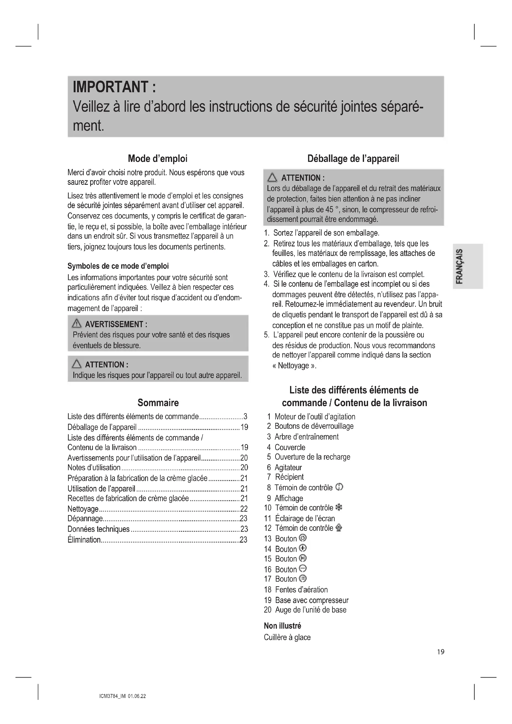 des résidus de production. Nous vous recommandons de nettoyer l’appareil comme indiqué dans la section « Nettoyage ». Liste des différents éléments de commande / Contenu de la livraison 1 Moteur de l’outil d’agitation 2 Boutons de déverrouillage 3 Arbre d’entraînement 4 Couvercle 5 Ouverture de la recharge 6 Agitateur 7 Récipient 8 Témoin de contrôle 9 Afchage 10 Témoin de contrôle 11 Éclairage de l’écran 12 Témoin de contrôle 13 Bouton 14 Bouton 15 Bouton 16 Bouton 17 Bouton 18 Fentes d’aération 19 Base avec compresseur 20 Auge de l’unité de base Non illustré Cuillère à glaceICM3784_IM 01.06.22