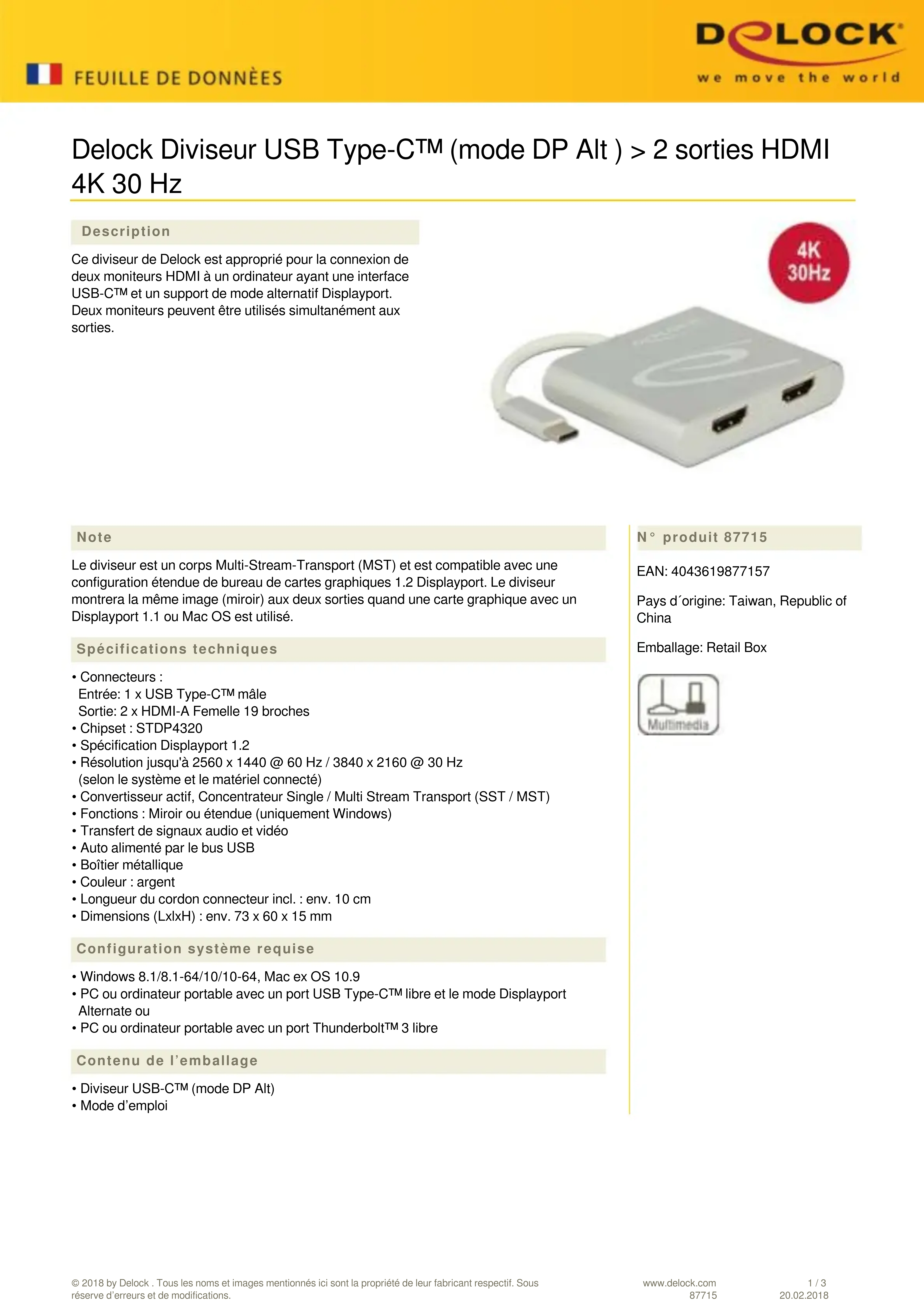- Connecteurs : Entrée : 1 x USB Type-CTM mâle Sortie : 2 x HDMI-A femelle 19 broches