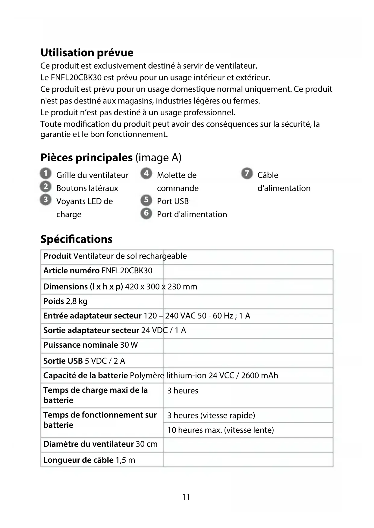 Câble d'alimentation Spécications Produit Ventilateur de sol rechargeable Article numéro FNFL20CBK30 Dimensions (l x h x p) 420 x 300 x 230 mm Poids 2,8 kg Entrée adaptateur secteur 120 – 240 VAC 50 - 60 Hz ; 1 A Sortie adaptateur secteur 24 VDC / 1 A Puissance nominale 30 W Sortie USB 5 VDC / 2 A Capacité de la batterie Polymère lithium-ion 24 VCC / 2600 mAh Temps de charge maxi de la batterie 3 heures Temps de fonctionnement sur batterie 3 heures (vitesse rapide) 10 heures max. (vitesse lente) Diamètre du ventilateur 30 cm Longueur de câble 1,5 m12 Consignes de sécurité