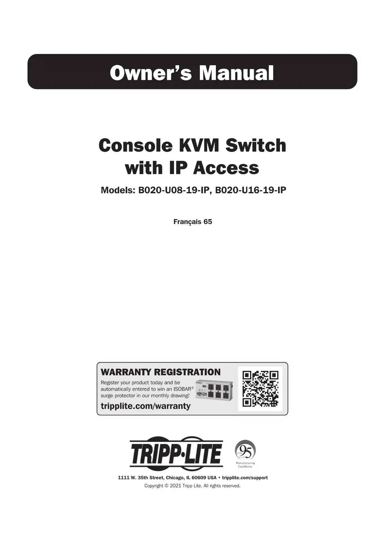 1111 W. 35th Street, Chicago, IL 60609 USA • tripplite.com/support 20-12-004 93-3D91_RevA65 Manuel de l'utilisateur Commutateur écran-clavier-souris pour console avec accès IP Modèles : B020-U08-19-IP, B020-U16-19-IP 1111 W. 35th Street, Chicago, IL 60609 USA • tripplite.com/supportDroits d'auteur © 2021 Tripp Lite. Tous droits réservés. English 166
