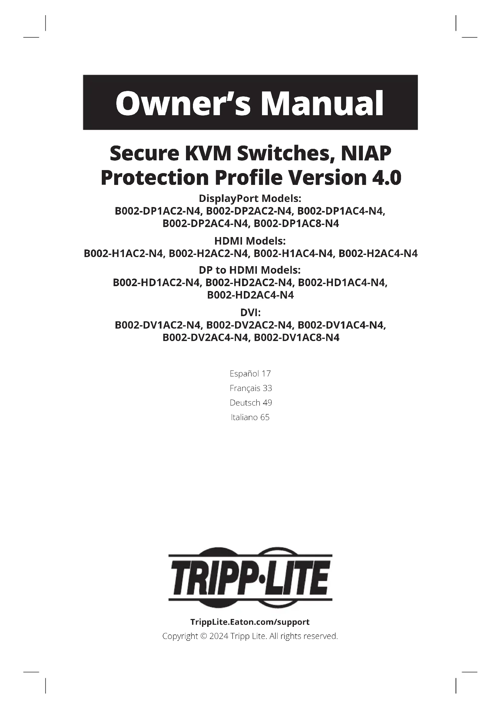 Enter. Remarque: une liste complète des Caractéristiques et des instructions pour l'utilitaire d'administration et de gestion de la sécurité sont disponibles dans le Guide de l'administrateur disponible sur TrippLite.Eaton.com/support.47 Fonctionnalités KVM diverses Autotest de mise sous tension Sitouslesvoyantsdupanneauavantsontallumésetneclignotentpas, l'Autotestdemisesoustensionaéchouéettouteslesfonctionssont désactivées.Vériezsil'undesboutonsdesélectiondel'alimentationdu panneauavantestbloqué.DanscecasBoîtier,relâchezleboutonbloquéet recyclezl'alimentation.Sil'échecdel'Autotestdemisesoustensionpersiste, contactezl'assistancetechniquedeTrippLite.Eaton.com/support. Contrôle du panneau avant PourCommutateuràunportd'entrée,appuyezsimplementsurlebouton d'entréedésirésurlePanneauavantduKVM.Lorsqu’unportd'entréeest sélectionné,levoyantcorrespondantàceports'allume.Unesessionouverteest interrompuelorsquevouschangezd'Ordinateur.48 TrippLite.Eaton.com/support 24-08-02793-4103_RevF Garantie Garantie limitée de 3ans TRIPPLITEgarantitquesesproduitssontexemptsdedéfautsdematériauxetde fabricationpendantunepériodedetrois(3)ansàcompterdeladated'achatinitiale. L'obligationdeTRIPPLITEautitredecettegarantieestlimitéeàlaréparationouau remplacement(àsaseulediscrétion)detoutproduitdéfectueux.Pourbénécier deceservicedanslecadredecettegarantie,vousdevezobtenirunnuméro d'autorisationderetourdematériel(RMA)auprèsdeTRIPPLITEoud'uncentrede serviceagrééTRIPPLITE.LesproduitsdoiventêtrerenvoyésàTrippLiteouauCentre deServiceTrippLiteagréé,fraisdetransportprépayés,accompagnésd'unebrève descriptionduproblèmerencontréetd'unepreuvedeladateetdulieud'achat. Cettegarantienes'appliquepasauxéquipementsquiontétéendommagéspar accident,négligenceouparunemauvaiseutilisation,niàceuxquiontétéaltérésou modiésd'unefaçonquelconque. SAUFINDICATIONCONTRAIRE,TRIPPLITENEDONNEAUCUNEGARANTIE,