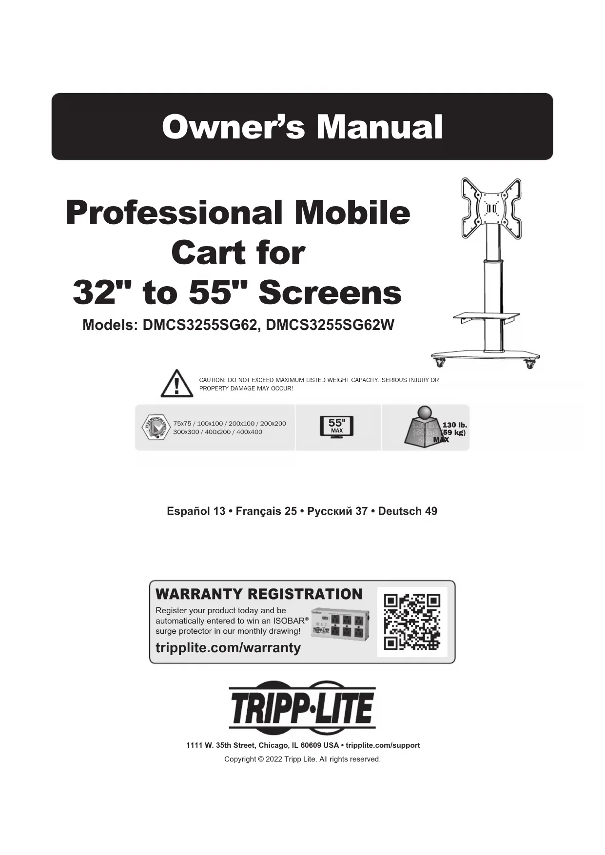 - Si tiene alguna pregunta, visite tripplite.com/support. Ajuste25 Manuel de l'utilisateur Chariot mobile professionnel pour écrans de 32 à 55 po Modèles : DMCS3255SG62, DMCS3255SG62W 1111 W. 35th Street, Chicago, IL 60609 USA • tripplite.com/support Droits d'auteur © 2022 Tripp Lite. Tous droits réservés. MISE EN GARDE : NE PAS EXCÉDER LA CAPACITÉ PONDÉRALE MAXIMUM INDIQUÉE. CELA RISQUERAIT DE CAUSER DES BLESSURES GRAVES OU DES DOMMAGES MATÉRIELS!75x75 / 100x100 / 200x100 / 200x200 300x300 / 400x200 / 400x400 55" MAX. 59 kg 59 kg (130 lb) (130 lb) MAX.MAX. English 1 • Español 13 • Русский 37 • Deutsch 4926 Consignes de sécurité Garantie Remarque : Lire le manuel d'instructions en entier avant de commencer l'assemblage et l'installation. AVERTISSEMENT