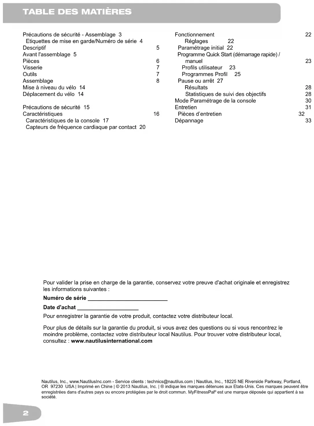 MANUEL D'ASSEMBLAGE / MANUEL D'UTILISATION Cette machine est conforme aux normes CE.2 Précautions de sécurité - Assemblage 3 Etiquettes de mise en garde/Numéro de série 4 Descriptif 5 Avant l'assemblage 5 Pièces 6 Visserie 7 Outils 7 Assemblage 8 Mise à niveau du vélo 14 Déplacement du vélo 14 Précautions de sécurité 15 Caractéristiques 16 Caractéristiques de la console 17 Capteurs de fréquence cardiaque par contact 20 Fonctionnement 22 Réglages 22 Paramétrage initial 22 Programme Quick Start (démarrage rapide) / manuel 23 Prolsutilisateur 23 ProgrammesProl 25 Pause ou arrêt 27 Résultats 28 Statistiques de suivi des objectifs 28 Mode Paramétrage de la console 30 Entretien 31 Pièces d’entretien 32 Dépannage 33 Nautilus, Inc., www.NautilusInc.com - Service clients : technics@nautilus.com | Nautilus, Inc., 18225 NE Riverside Parkway, Portland, OR 97230 USA | Imprimé en Chine | © 2013 Nautilus, Inc. | ® indique les marques détenues aux Etats-Unis. Ces marques peuvent être enregistrées dans d'autres pays ou encore protégées par le droit commun. MyFitnessPal