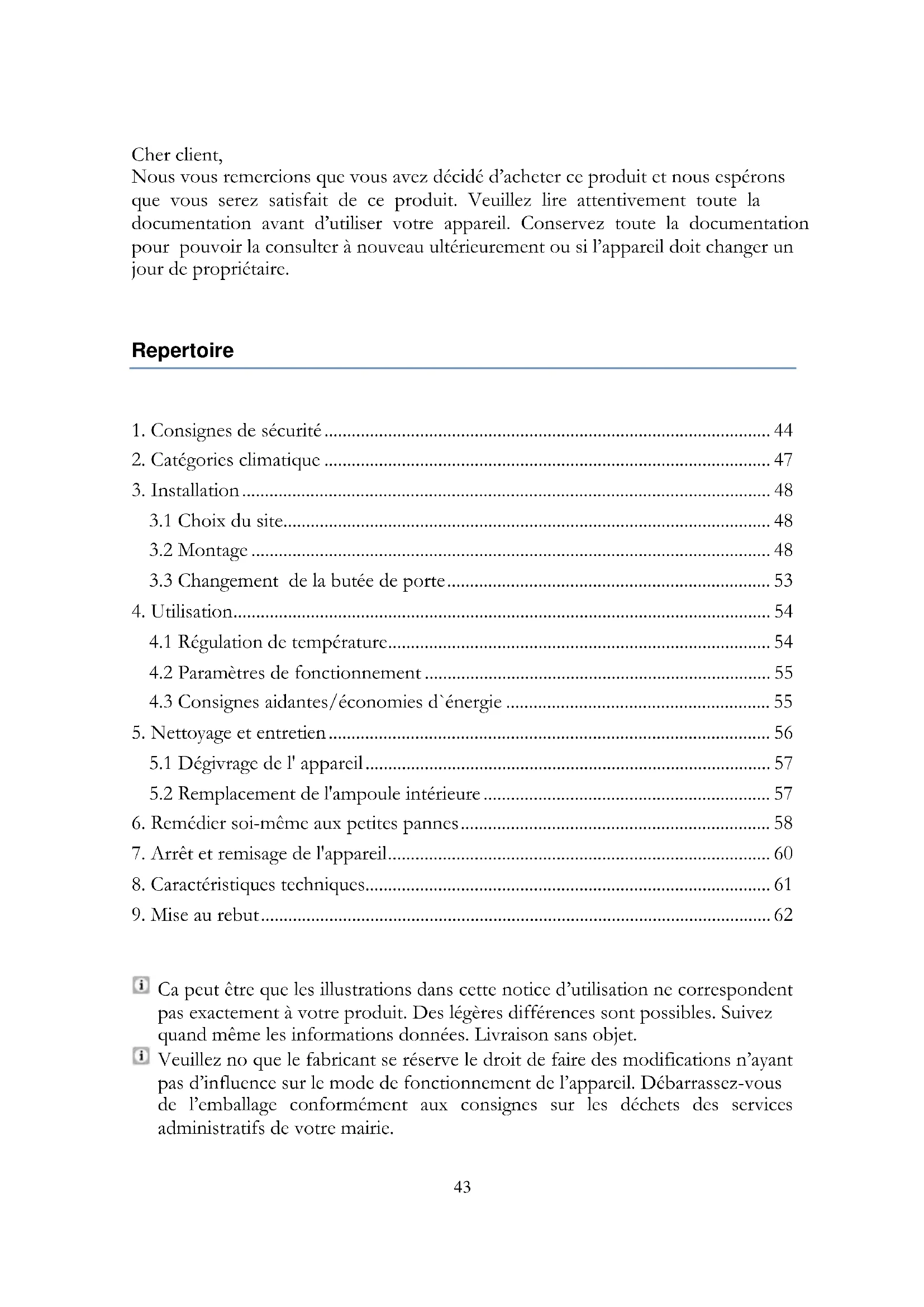- August 201443 Cher client, Nous vous remercions que vous avez décidé d’acheter ce produit et nous espérons que vous serez satisfait de ce produit. Veuillez lire attentivement toute la documentation avant d’utiliser votre appareil. Conservez toute la documentation pour pouvoir la consulter à nouveau ultérieurement ou si l’appareil doit changer un jour de propriétaire. Repertoire 1. Consignes de sécurité p. 44