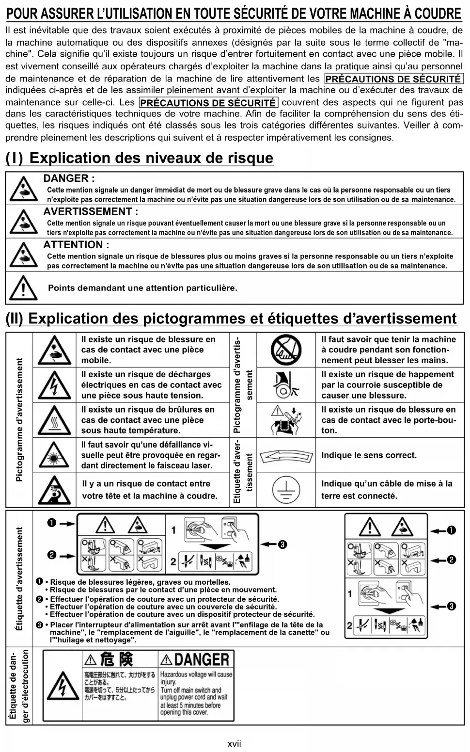 Cette Pention signale un risTue Souvant pventuellePent causer la Port ou une blessure grave si la Sersonne resSonsable ou un tiers n¶e[Sloite Sas correctePent la Pachine ou n¶pvite Sas une situation dangereuse lors de son utilisation ou de sa Paintenance. ATTENTION : Cette Pention signale un risTue de blessures Slus ou Poins graves si la Sersonne resSonsable ou un tiers n¶e[Sloite Sas correctePent la Pachine ou n¶pvite Sas une situation dangereuse lors de son utilisation ou de sa Paintenance. Points dePandant une attention Sarticuliqre. (II) E[Slication des SictograPPes et ptiTuettes d¶avertissePent (I) E[Slication des niveau[ de risTuexviii