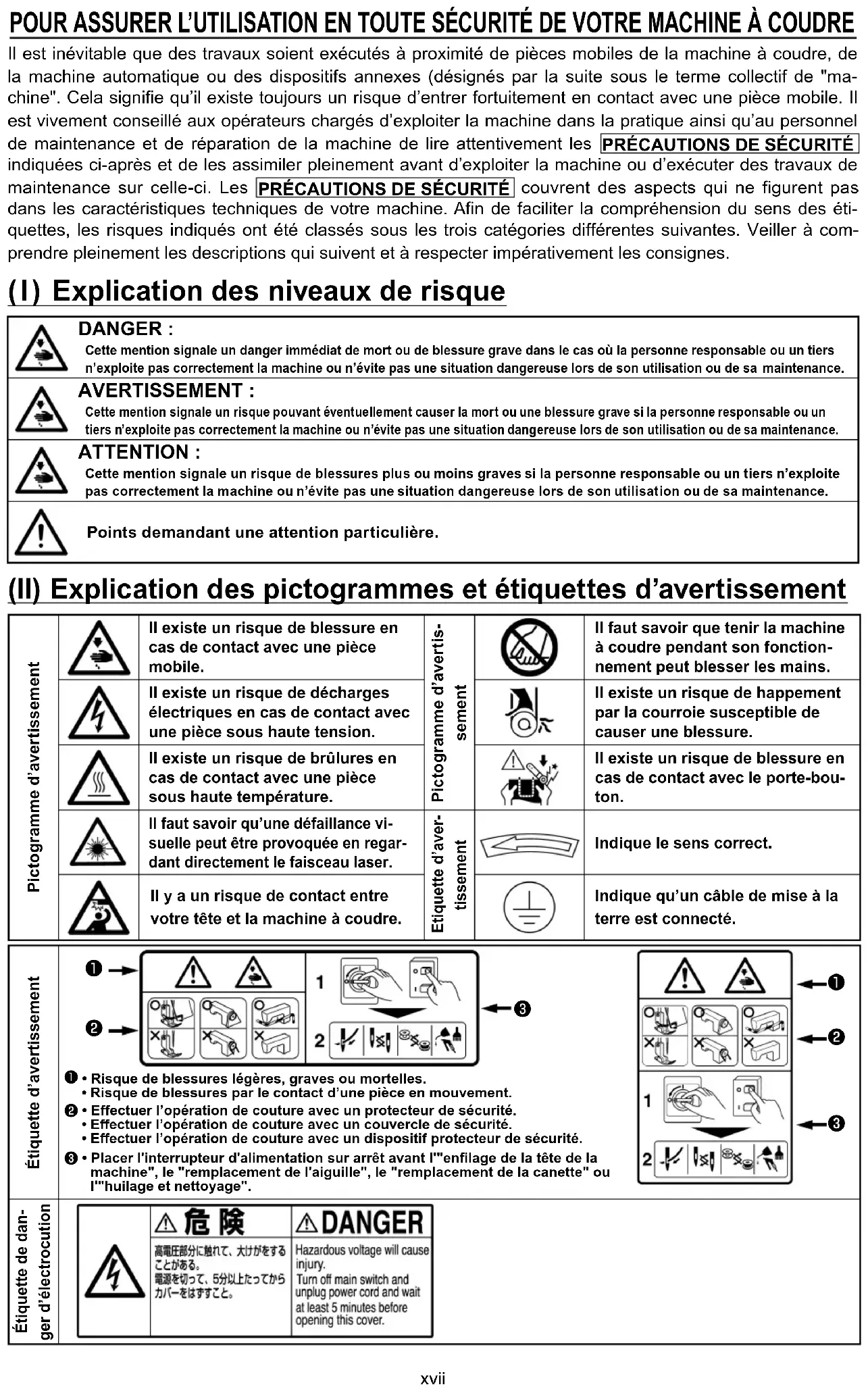 Cette Pention signale un risTue Souvant pventuellePent causer la Port ou une blessure grave si la Sersonne resSonsable ou un tiers n¶e[Sloite Sas correctePent la Pachine ou n¶pvite Sas une situation dangereuse lors de son utilisation ou de sa Paintenance. ATTENTION : Cette Pention signale un risTue de blessures Slus ou Poins graves si la Sersonne resSonsable ou un tiers n¶e[Sloite Sas correctePent la Pachine ou n¶pvite Sas une situation dangereuse lors de son utilisation ou de sa Paintenance. Points dePandant une attention Sarticuliqre. (II) E[Slication des SictograPPes et ptiTuettes d¶avertissePent (I) E[Slication des niveau[ de risTuexviii