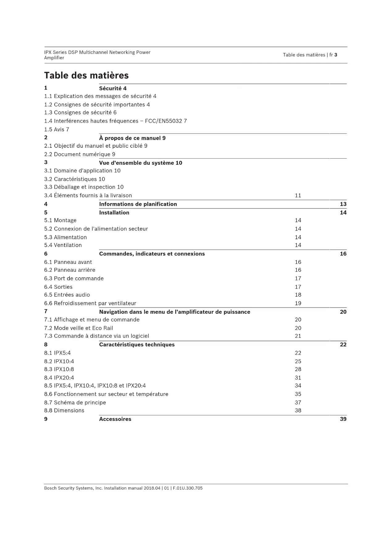 de sécurité spécifiées dans la norme EN 60065 (VDE0860).6 fr | Sécurité IPX Series DSP Multichannel Networking Power Amplifier 2018.04 | 01 | F.01U.330.705 Installation manual Bosch Security Systems, Inc.