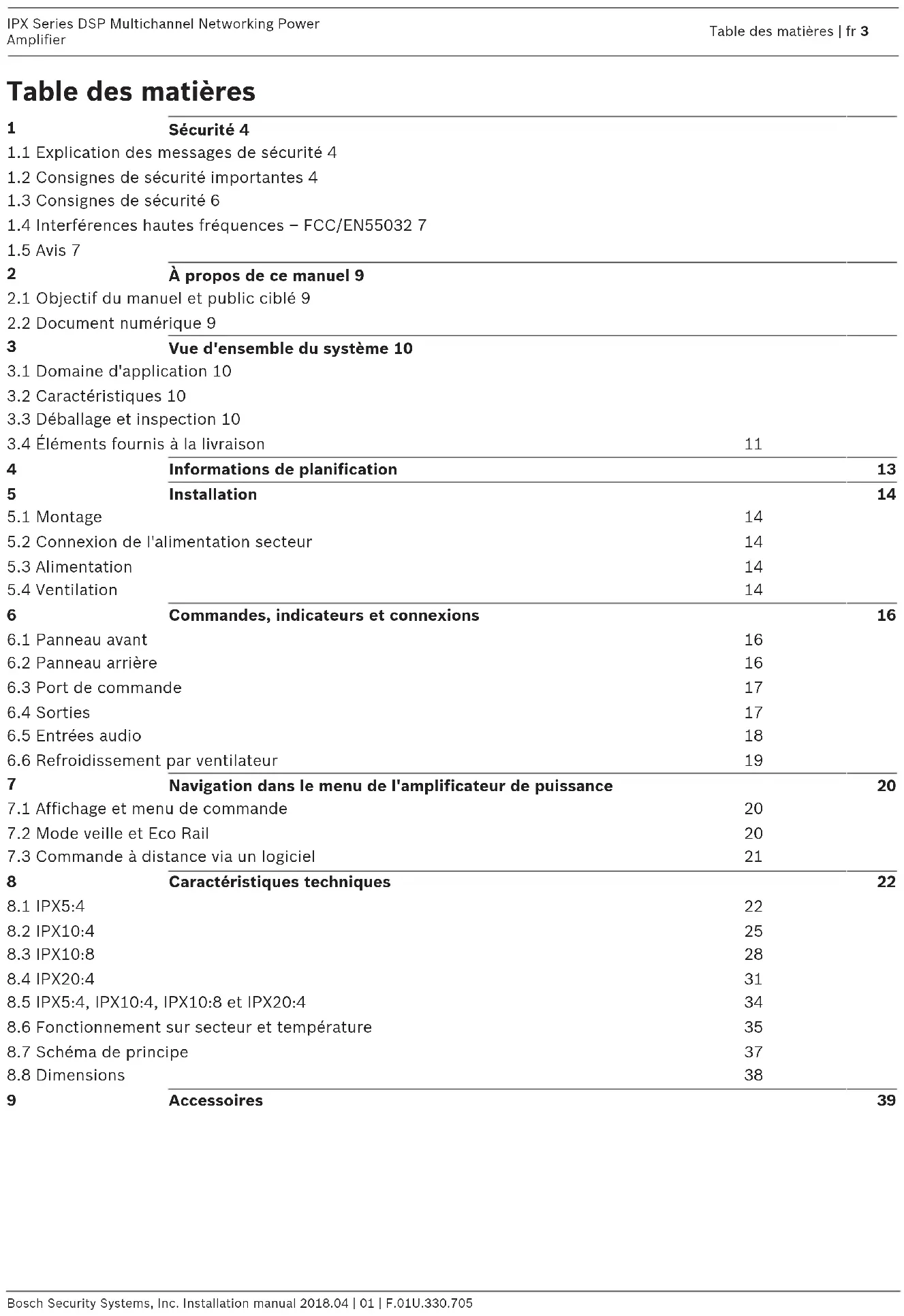 de sécurité spécifiées dans la norme EN 60065 (VDE0860).6 fr | Sécurité IPX Series DSP Multichannel Networking Power Amplifier 2018.04 | 01 | F.01U.330.705 Installation manual Bosch Security Systems, Inc.