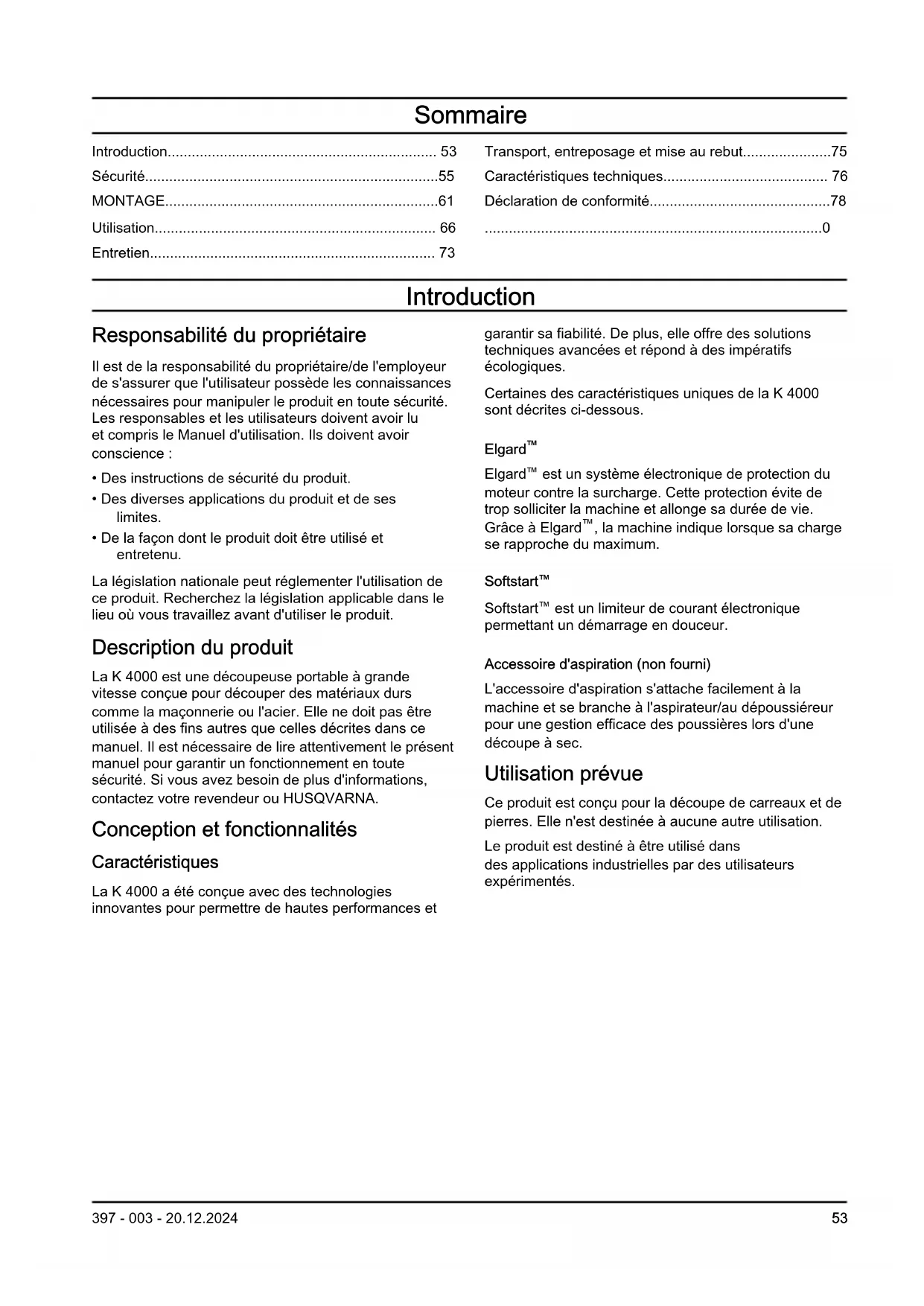 - Déclaration de conformité UE Nous, Husqvarna AB, SE-56182Huskvarna, SUÈDE, tél.: +46-36-146500, déclarons sous notre entière responsabilité que le produit: Description Découpeuse portative Marque HUSQVARNA Type/Modèle K 4000 Identification Numéros de série à partir de 2022 et ultérieurs est entièrement conforme à la réglementation et aux directives de l'UE suivantes: Directive/Réglementation Description 2006/42/EC «relative aux machines» 2014/30/EU «relative à la compatibilité électromagnétique» 2011/65/EU «relative à la limitation de l'utilisation de certaines substances dangereuses» et que les normes et/ou les spécifications techniques suivantes sont appliquées: EN ISO 12100:2010 EN 60745-2-22:2011/A11:2013 EN 55014-1:2017 EN 55014-2:2015 EN 61000-3-2:2014 EN 61000-3-3:2013 EN IEC 63000:2018 Partille, 2022-10-12 Fredrik Sandinge Directeur R&D Équipement de forage et de découpe du béton Husqvarna AB, division Construction Responsable de la documentation technique 78 397 - 003 - 20.12.2024Inhoud Inleiding p. 79
