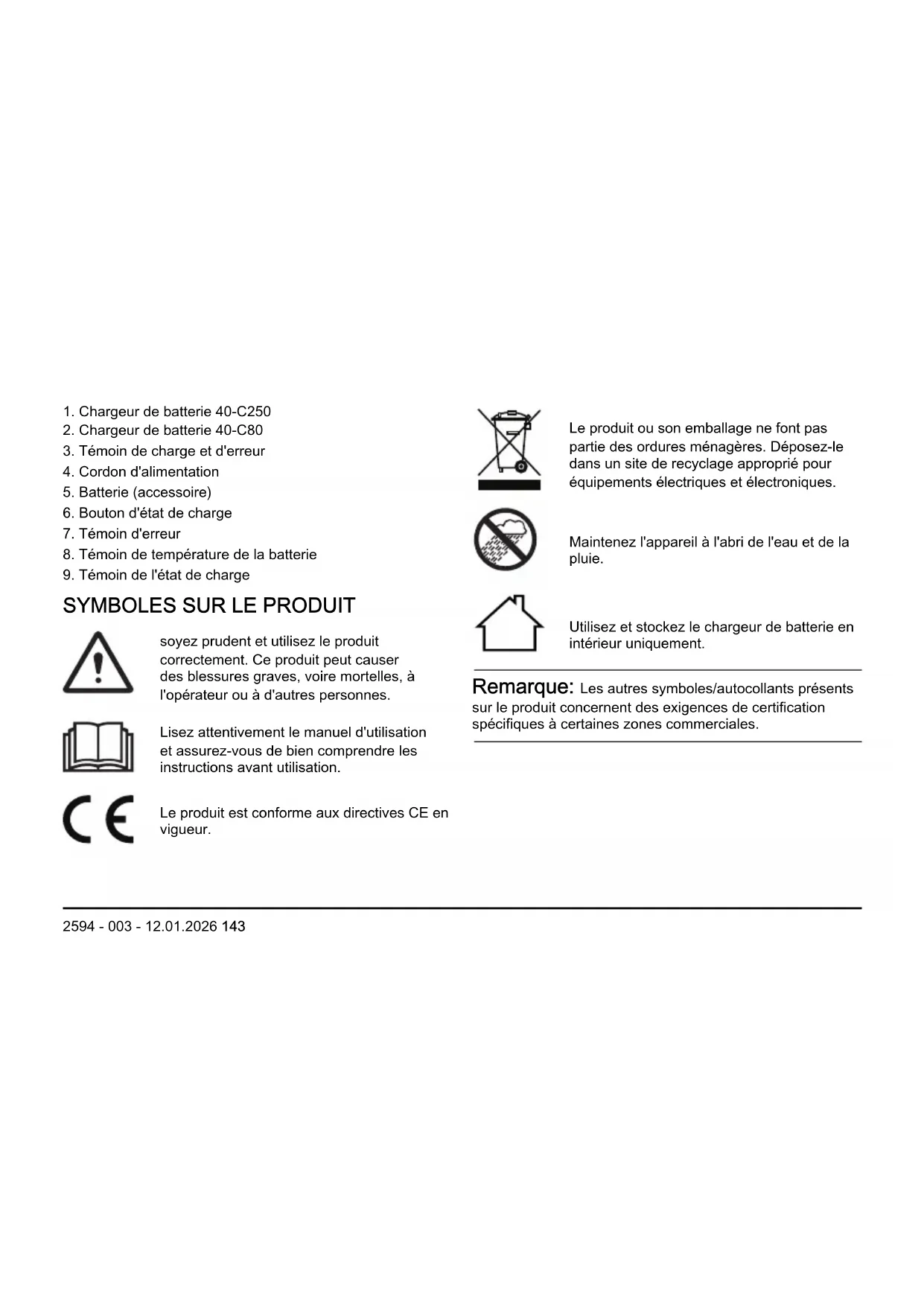 soyez prudent et utilisez le produit correctement. Ce produit peut causer des blessures graves, voire mortelles, à l'opérateur ou à d'autres personnes. Lisez attentivement le manuel d'utilisation et assurez-vous de bien comprendre les instructions avant utilisation. Le produit est conforme aux directives CE en vigueur. Le produit ou son emballage ne font pas partie des ordures ménagères. Déposez-le dans un site de recyclage approprié pour équipements électriques et électroniques. Maintenez l'appareil à l'abri de l'eau et de la pluie. Utilisez et stockez le chargeur de batterie en intérieur uniquement. Remarque: Les autres symboles/autocollants présents sur le produit concernent des exigences de certification spécifiques à certaines zones commerciales. 2594 - 003 - 12.01.2026 143Symboles de conformité Points de collecte sur www.quefairedemesdechets.fr l ! À DÉPOSEREN MAGASINÀ DÉPOSEREN DÉCHÈTERIE