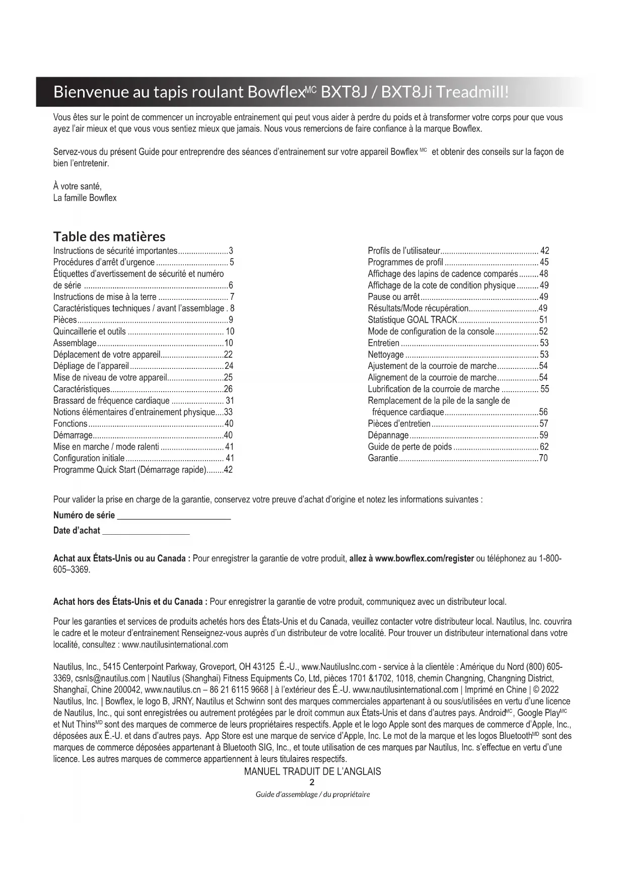 BXT8J / BXT8Ji Treadmill! Pour valider la prise en charge de la garantie, conservez votre preuve d’achat d’origine et notez les informations suivantes : Numéro de série __________________________ Date d’achat ____________________ Achat aux États-Unis ou au Canada : Pour enregistrer la garantie de votre produit, allez à www.bowex.com/register ou téléphonez au 1-800- 605–3369. Achat hors des États-Unis et du Canada : Pour enregistrer la garantie de votre produit, communiquez avec un distributeur local. Pour les garanties et services de produits achetés hors des États-Unis et du Canada, veuillez contacter votre distributeur local. Nautilus, Inc. couvrira le cadre et le moteur d’entrainement Renseignez-vous auprès d’un distributeur de votre localité. Pour trouver un distributeur international dans votre localité, consultez : www.nautilusinternational.com Nautilus, Inc., 5415 Centerpoint Parkway, Groveport, OH 43125 É.-U., www.NautilusInc.com - service à la clientèle : Amérique du Nord (800) 605- 3369, csnls@nautilus.com | Nautilus (Shanghai) Fitness Equipments Co, Ltd, pièces 1701 &1702, 1018, chemin Changning, Changning District, Shanghaï, Chine 200042, www.nautilus.cn – 86 21 6115 9668 | à l’extérieur des É.-U. www.nautilusinternational.com | Imprimé en Chine | © 2022 Nautilus, Inc. | Bowex, le logo B, JRNY, Nautilus et Schwinn sont des marques commerciales appartenant à ou sous/utilisées en vertu d’une licence de Nautilus, Inc., qui sont enregistrées ou autrement protégées par le droit commun aux États-Unis et dans d’autres pays. Android