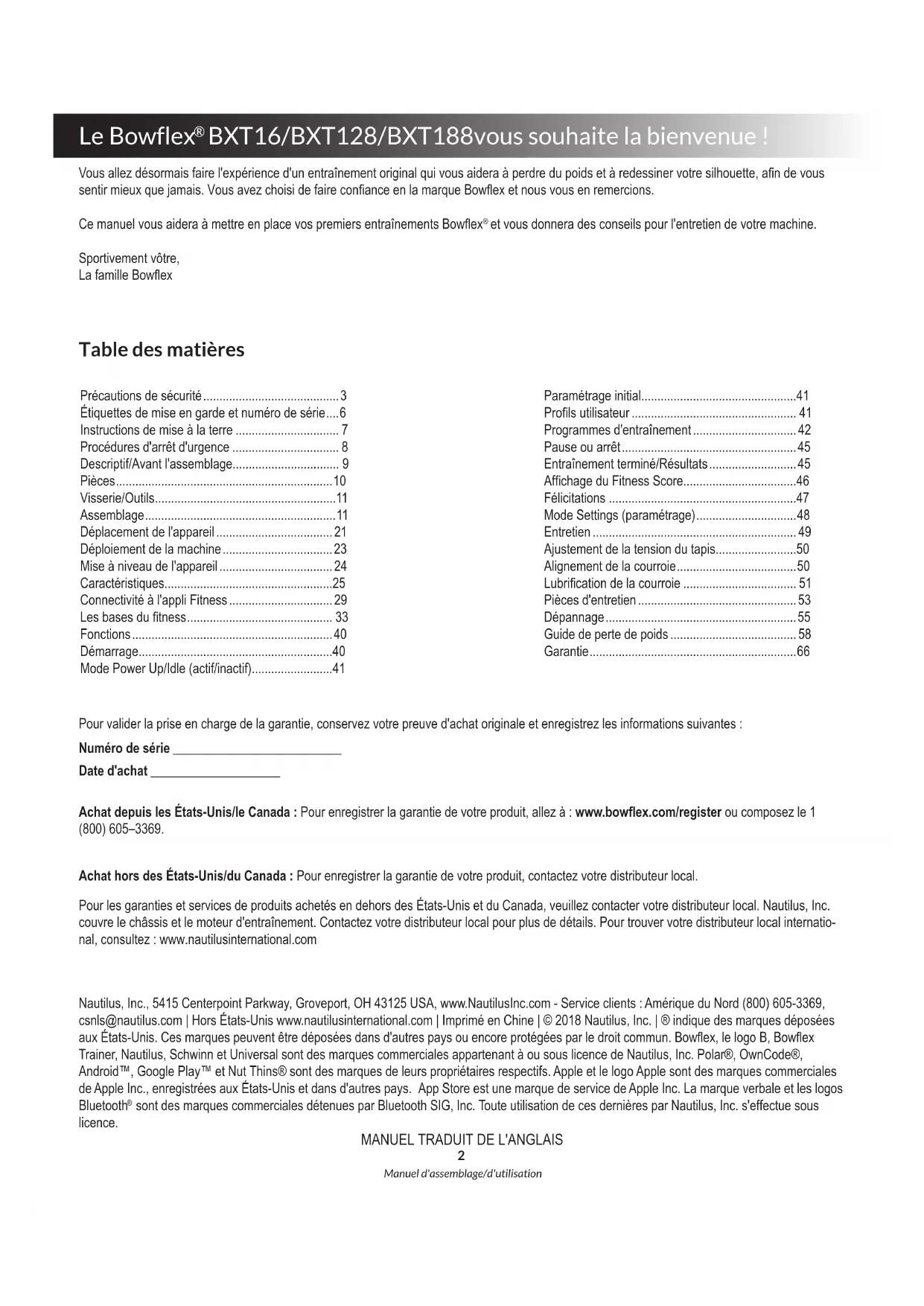 et vous donnera des conseils pour l'entretien de votre machine. Sportivement vôtre, La famille Bowex Table des matières Pour valider la prise en charge de la garantie, conservez votre preuve d'achat originale et enregistrez les informations suivantes : Numéro de série __________________________ Date d'achat ____________________ Achat depuis les États-Unis/le Canada : Pour enregistrer la garantie de votre produit, allez à : www.bowex.com/register ou composez le 1 (800) 605–3369. Achat hors des États-Unis/du Canada : Pour enregistrer la garantie de votre produit, contactez votre distributeur local. Pour les garanties et services de produits achetés en dehors des États-Unis et du Canada, veuillez contacter votre distributeur local. Nautilus, Inc. couvre le châssis et le moteur d'entraînement. Contactez votre distributeur local pour plus de détails. Pour trouver votre distributeur local internatio- nal, consultez : www.nautilusinternational.com Nautilus, Inc., 5415 Centerpoint Parkway, Groveport, OH 43125 USA, www.NautilusInc.com - Service clients : Amérique du Nord (800) 605-3369, csnls@nautilus.com | Hors États-Unis www.nautilusinternational.com | Imprimé en Chine | © 2018 Nautilus, Inc. | ® indique des marques déposées aux États-Unis. Ces marques peuvent être déposées dans d'autres pays ou encore protégées par le droit commun. Bowex, le logo B, Bowex Trainer, Nautilus, Schwinn et Universal sont des marques commerciales appartenant à ou sous licence de Nautilus, Inc. Polar®, OwnCode®, Android™, Google Play™ et Nut Thins® sont des marques de leurs propriétaires respectifs. Apple et le logo Apple sont des marques commerciales de Apple Inc., enregistrées aux États-Unis et dans d'autres pays. App Store est une marque de service de Apple Inc. La marque verbale et les logos Bluetooth