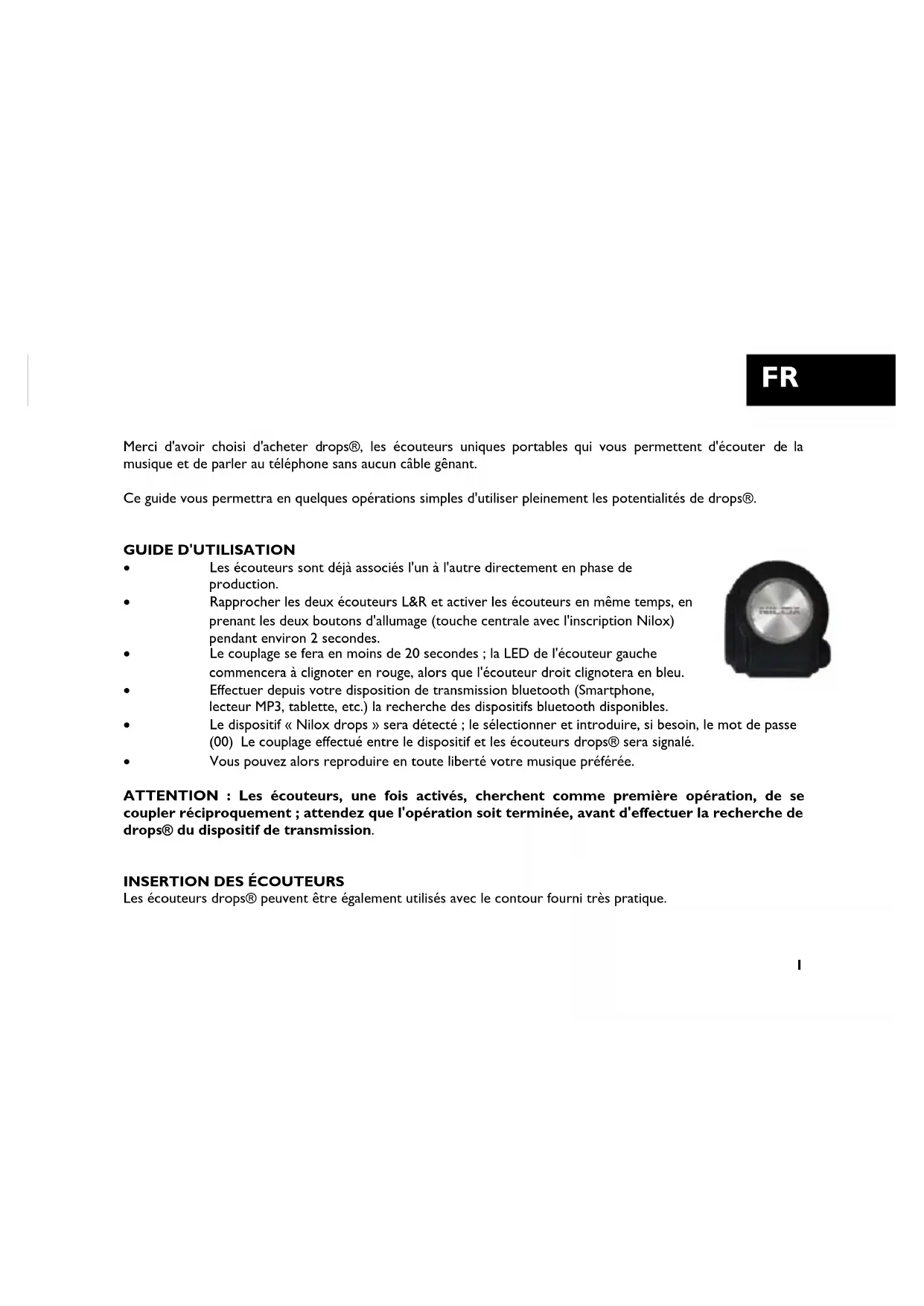 Merci d'avoir choisi d'acheter drops®, les écouteurs uniques portables qui vous permettent d'écouter de la musique et de parler au téléphone sans aucun câble gênant. Ce guide vous permettra en quelques opérations simples d'utiliser pleinement les potentialités de drops®.
