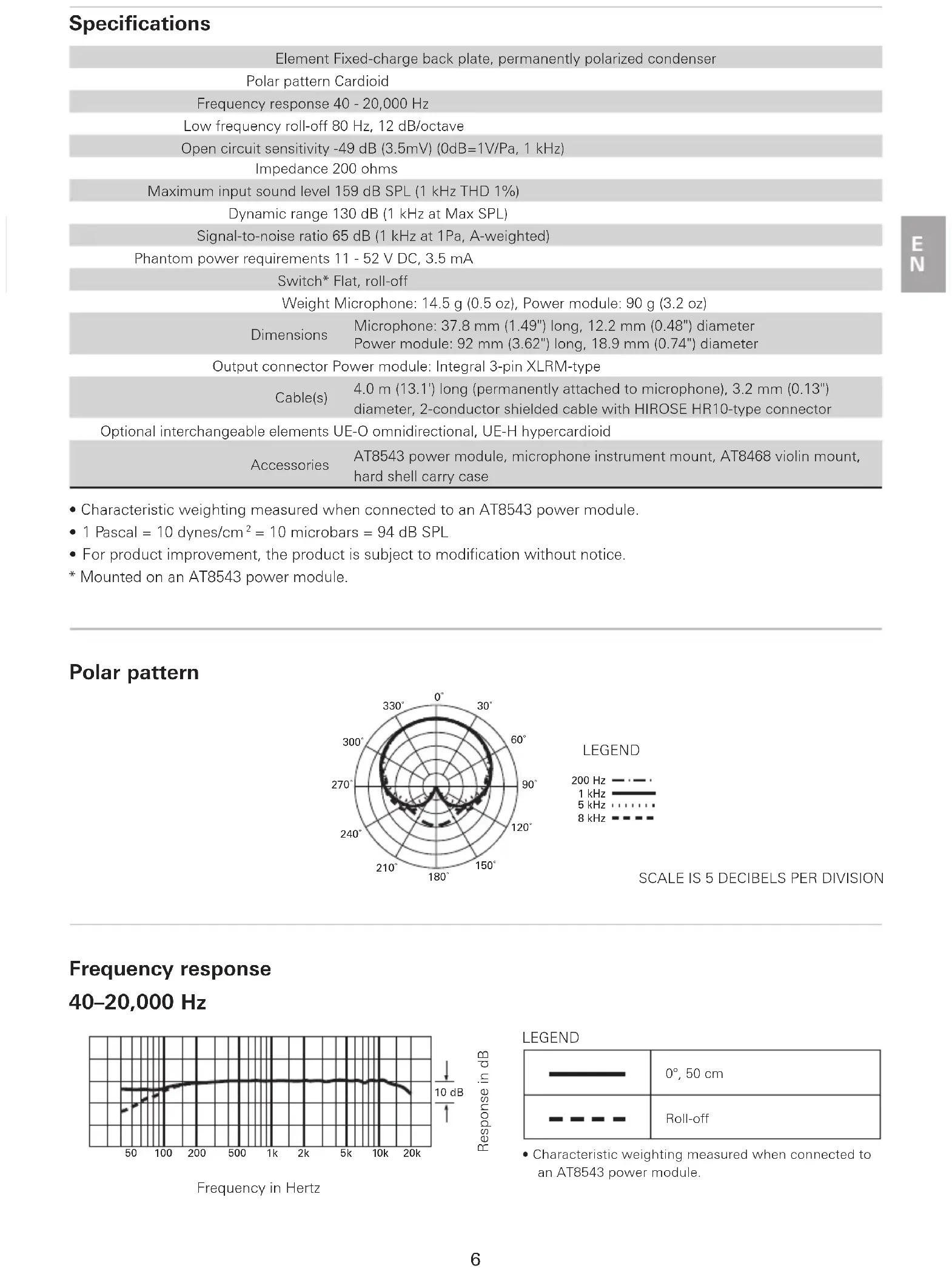 Caractéristiques techniques Capsule Statique à électret Directivité Cardioïde Réponse en fréquence 40-20 000 Hz Filtre coupe-bas* 80 Hz, 12 dB/octave Sensibilité -49 dB (3,5mV) (0dB=1V/Pa, 1 kHz) Impédance 200 ohms Pression Acoustique Maximale 159 dB SPL (1 kHz THD 1%) Dynamique 130 dB (1 kHz à SPL Max) Rapport signal/bruit 65 dB (1 kHz at 1Pa, pondéré en A) Alimentation fantôme 11 V à 52 V CC, 3,5 mA Commutateur* Plat, Coupe-bas Poids Microphone : 14,5 g, Module d'alimentation : 90 g Dimensions Microphone : Longueur 37,8 mm, diamètre 12,2 mm Module d'alimentation : Longueur 92 mm, diamètre 18,9 mm Connecteur de sortie Module d'alimentation : Type XLRM 3 broches intégré Câble(s) Longueur 4 m (solidaire du microphone), diamètre 3,2 mm, câble blindé à 2 conducteurs avec connecteur type HIROSE HR10 Capsules interchangeables (en option) UE-O omnidirectionnel, UE-H hypercardioïde Accessoires Module d'alimentation AT8543, fixation pour instrument, fixation pour violon AT8468, étui de transport rigide