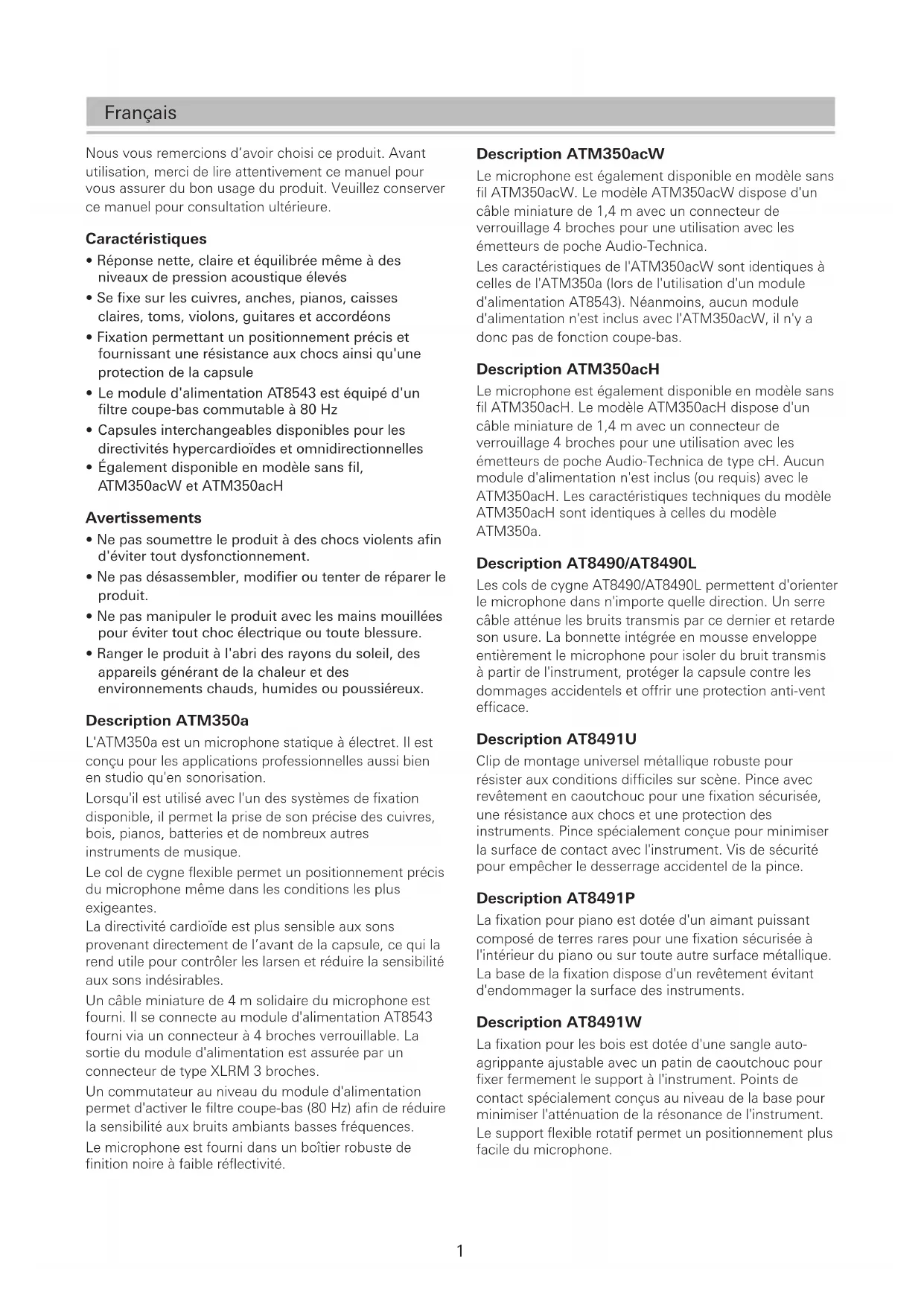 - Characteristic weighting measured when connected to an AT8543 power module. Frequency in Hertz Response in dB 0°, 50 cm Roll-off1 Français Description ATM350acW Le microphone est également disponible en modèle sans fil ATM350acW. Le modèle ATM350acW dispose d'un câble miniature de 1,4m avec un connecteur de verrouillage 4broches pour une utilisation avec les émetteurs de poche Audio-Technica. Les caractéristiques de l'ATM350acW sont identiques à celles de l'ATM350a (lors de l'utilisation d'un module d'alimentation AT8543). Néanmoins, aucun module d'alimentation n'est inclus avec l'ATM350acW, il n'y a donc pas de fonction coupe-bas. Description ATM350acH Le microphone est également disponible en modèle sans fil ATM350acH. Le modèle ATM350acH dispose d'un câble miniature de 1,4 m avec un connecteur de verrouillage 4 broches pour une utilisation avec les émetteurs de poche Audio-Technica de type cH. Aucun module d'alimentation n'est inclus (ou requis) avec le ATM350acH. Les caractéristiques techniques du modèle ATM350acH sont identiques à celles du modèle ATM350a. Description AT8490/AT8490L Les cols de cygne AT8490/AT8490L permettent d'orienter le microphone dans n'importe quelle direction. Un serre câble atténue les bruits transmis par ce dernier et retarde son usure. La bonnette intégrée en mousse enveloppe entièrement le microphone pour isoler du bruit transmis à partir de l'instrument, protéger la capsule contre les dommages accidentels et offrir une protection anti-vent efficace. Description AT8491U Clip de montage universel métallique robuste pour résister aux conditions difficiles sur scène. Pince avec revêtement en caoutchouc pour une fixation sécurisée, une résistance aux chocs et une protection des instruments. Pince spécialement conçue pour minimiser la surface de contact avec l'instrument. Vis de sécurité pour empêcher le desserrage accidentel de la pince. Description AT8491P La fixation pour piano est dotée d'un aimant puissant composé de terres rares pour une fixation sécurisée à l'intérieur du piano ou sur toute autre surface métallique. La base de la fixation dispose d'un revêtement évitant d'endommager la surface des instruments. Description AT8491W La fixation pour les bois est dotée d'une sangle auto- agrippante ajustable avec un patin de caoutchouc pour fixer fermement le support à l'instrument. Points de contact spécialement conçus au niveau de la base pour minimiser l'atténuation de la résonance de l'instrument. Le support flexible rotatif permet un positionnement plus facile du microphone. Nous vous remercions d’avoir choisi ce produit. Avant utilisation, merci de lire attentivement ce manuel pour vous assurer du bon usage du produit. Veuillez conserver ce manuel pour consultation ultérieure. Caractéristiques