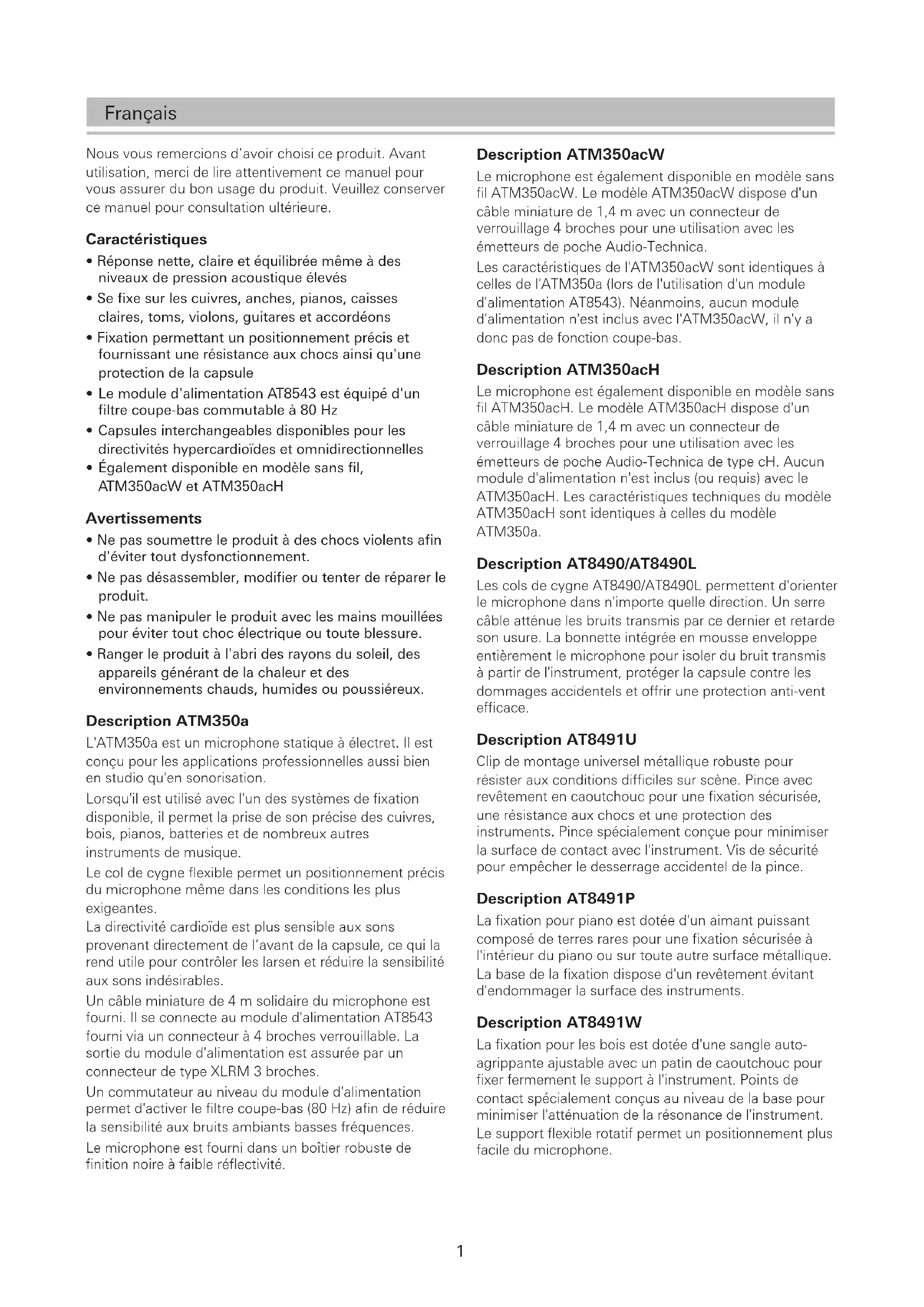 - Characteristic weighting measured when connected to an AT8543 power module. Frequency in Hertz Response in dB 0°, 50 cm Roll-off1 Français Description ATM350acW Le microphone est également disponible en modèle sans fil ATM350acW. Le modèle ATM350acW dispose d'un câble miniature de 1,4m avec un connecteur de verrouillage 4broches pour une utilisation avec les émetteurs de poche Audio-Technica. Les caractéristiques de l'ATM350acW sont identiques à celles de l'ATM350a (lors de l'utilisation d'un module d'alimentation AT8543). Néanmoins, aucun module d'alimentation n'est inclus avec l'ATM350acW, il n'y a donc pas de fonction coupe-bas. Description ATM350acH Le microphone est également disponible en modèle sans fil ATM350acH. Le modèle ATM350acH dispose d'un câble miniature de 1,4 m avec un connecteur de verrouillage 4 broches pour une utilisation avec les émetteurs de poche Audio-Technica de type cH. Aucun module d'alimentation n'est inclus (ou requis) avec le ATM350acH. Les caractéristiques techniques du modèle ATM350acH sont identiques à celles du modèle ATM350a. Description AT8490/AT8490L Les cols de cygne AT8490/AT8490L permettent d'orienter le microphone dans n'importe quelle direction. Un serre câble atténue les bruits transmis par ce dernier et retarde son usure. La bonnette intégrée en mousse enveloppe entièrement le microphone pour isoler du bruit transmis à partir de l'instrument, protéger la capsule contre les dommages accidentels et offrir une protection anti-vent efficace. Description AT8491U Clip de montage universel métallique robuste pour résister aux conditions difficiles sur scène. Pince avec revêtement en caoutchouc pour une fixation sécurisée, une résistance aux chocs et une protection des instruments. Pince spécialement conçue pour minimiser la surface de contact avec l'instrument. Vis de sécurité pour empêcher le desserrage accidentel de la pince. Description AT8491P La fixation pour piano est dotée d'un aimant puissant composé de terres rares pour une fixation sécurisée à l'intérieur du piano ou sur toute autre surface métallique. La base de la fixation dispose d'un revêtement évitant d'endommager la surface des instruments. Description AT8491W La fixation pour les bois est dotée d'une sangle auto- agrippante ajustable avec un patin de caoutchouc pour fixer fermement le support à l'instrument. Points de contact spécialement conçus au niveau de la base pour minimiser l'atténuation de la résonance de l'instrument. Le support flexible rotatif permet un positionnement plus facile du microphone. Nous vous remercions d’avoir choisi ce produit. Avant utilisation, merci de lire attentivement ce manuel pour vous assurer du bon usage du produit. Veuillez conserver ce manuel pour consultation ultérieure. Caractéristiques