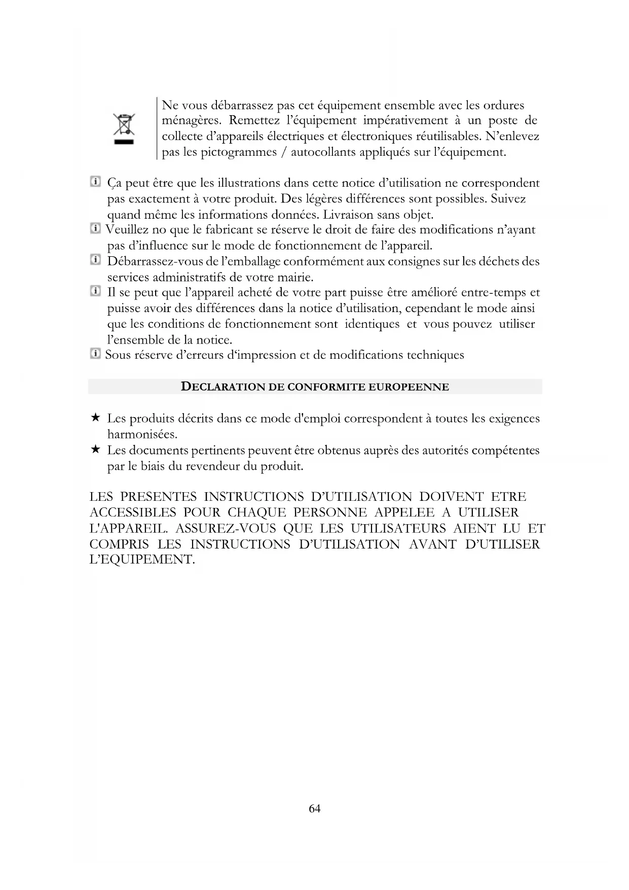 Les produits décrits dans ce mode d'emploi correspondent à toutes les exigences harmonisées. Les documents pertinents peuvent être obtenus auprès des autorités compétentes par le biais du revendeur du produit. LES PRESENTES INSTRUCTIONS D’UTILISATION DOIVENT ETRE ACCESSIBLES POUR CHAQUE PERSONNE APPELEE A UTILISER L'APPAREIL. ASSUREZ-VOUS QUE LES UTILISATEURS AIENT LU ET COMPRIS LES INSTRUCTIONS D’UTILISATION AVANT D’UTILISER L’EQUIPEMENT.65