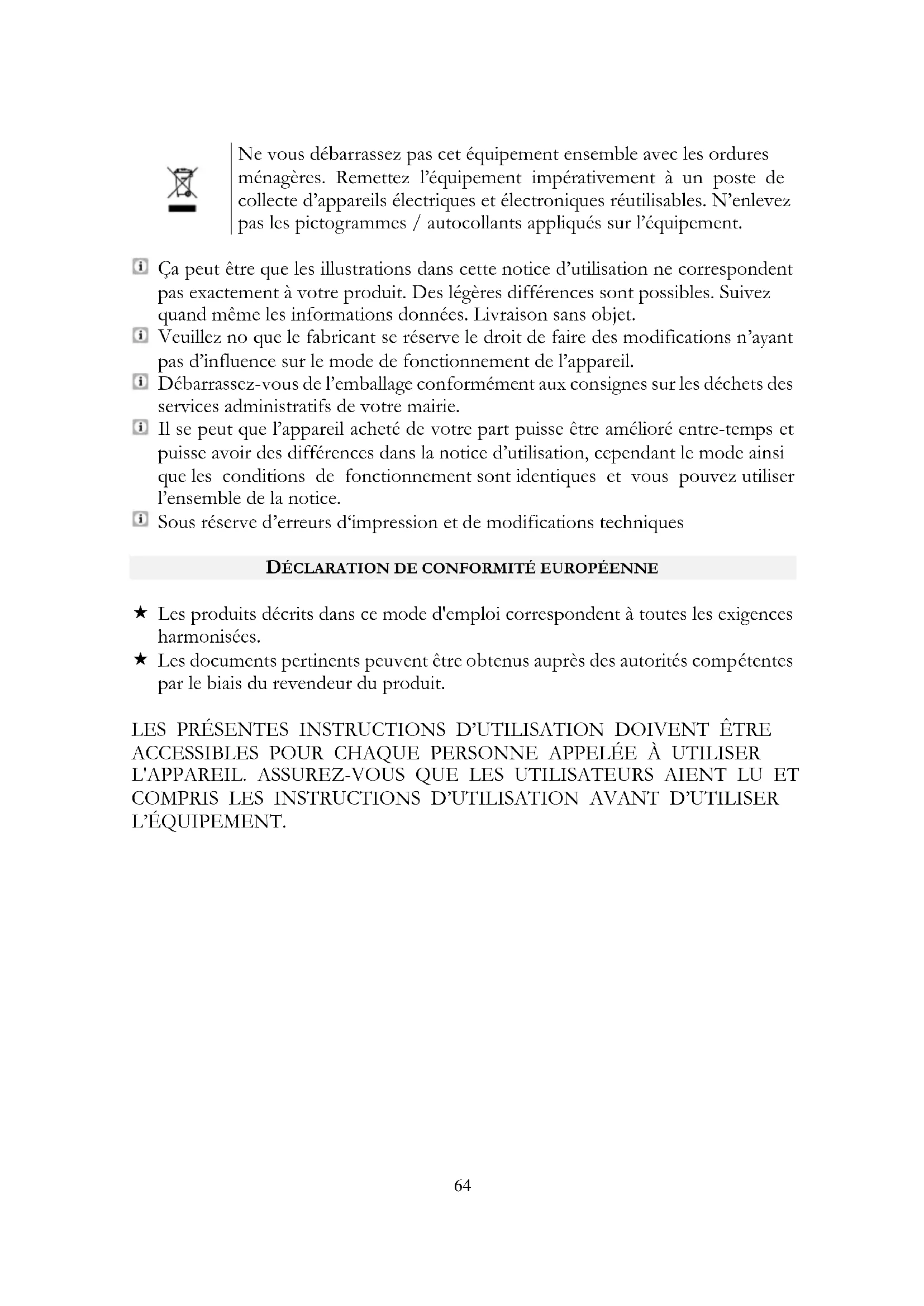 - August 201463 Cher client, Nous vous remercions que vous avez décidé d’acheter ce produit et nous espérons que vous serez satisfait de ce produit. Veuillez lire attentivement toute la documentation avant d’utiliser votre appareil. Conservez toute la documentation pour pouvoir la consulter à nouveau ultérieurement ou si l’appareil doit changer un jour de propriétaire. Contenu 1. Consignes de sécurité p. 65