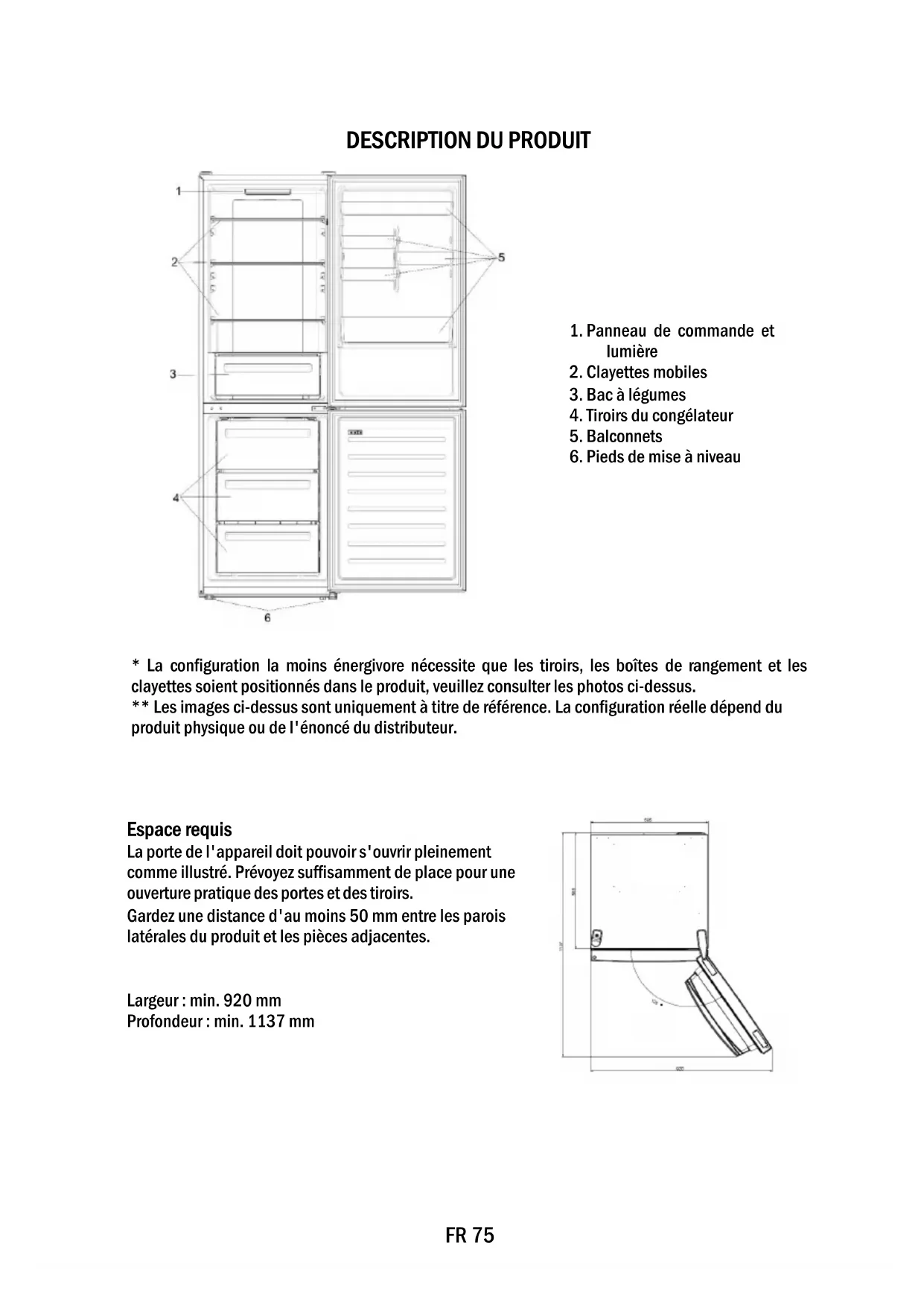 - La configuration la moins énergivore nécessite que les tiroirs, les boîtes de rangement et les clayettes soient positionnés dans le produit, veuillez consulter les photos ci-dessus. ** Les images ci-dessus sont uniquement à titre de référence. La configuration réelle dépend du produit physique ou de l'énoncé du distributeur. Espace requis La porte de l'appareil doit pouvoir s'ouvrir pleinement comme illustré. Prévoyez suffisamment de place pour une ouverture pratique des portes et des tiroirs. Gardez une distance d'au moins 50 mm entre les parois latérales du produit et les pièces adjacentes. Largeur : min. 920 mm Profondeur : min. 1137 mmFR 76 UTILISATION ➀ Touche Marche/Arrêt, utilisée pour allumer/éteindre l'appareil. ➁ Touche Mode, utilisée pour sélectionner la température du réfrigérateur ou les fonctions spéciales comme. ➂ L’icône Wi-Fi indique si l’appareil est connecté à l’application. ➃ L'icône Super refroidissement indique si la fonction est activée. ➄ Niveaux de température, indiquant quelle est la température sélectionnée. Utilisation