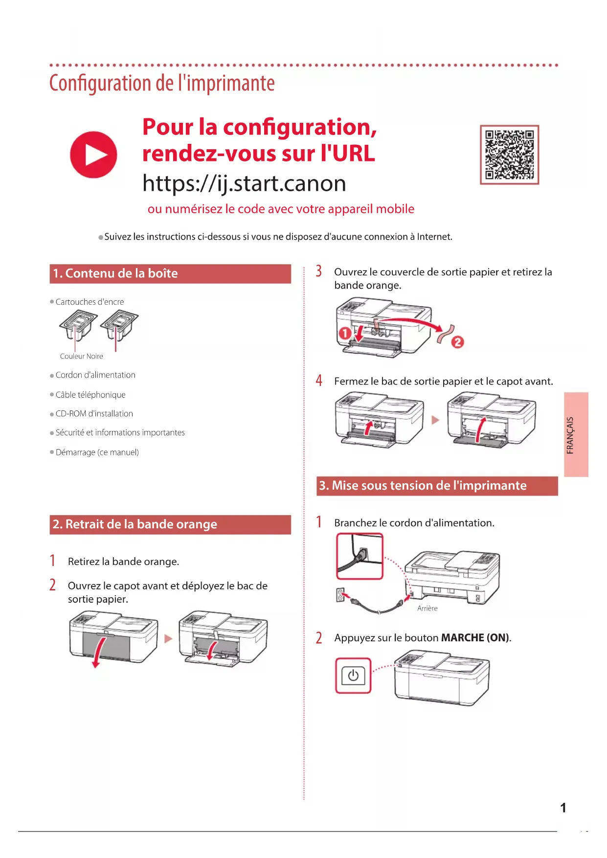 Appuyez sur le bouton MARCHE (ON). Pour la conguration, rendez-vous sur l'URL https://ij.start.canon ou numérisez le code avec votre appareil mobile