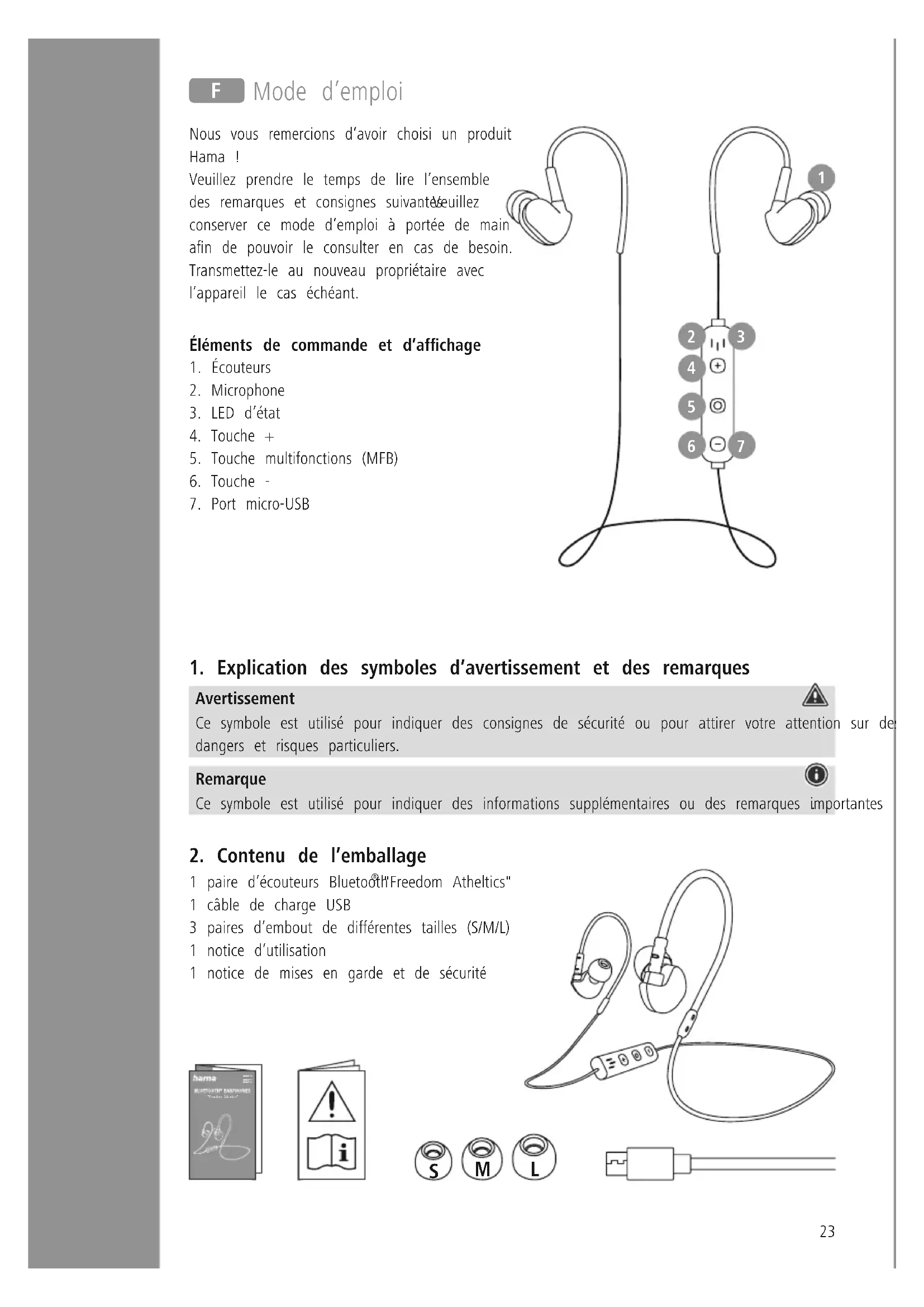 "Freedom Atheltics" 1 câble de charge USB 3 paires d’embout de différentes tailles (S/M/L) 1 notice d’utilisation 1 notice de mises en garde et de sécurité 001841180018411900184120"Freedom Athletics"