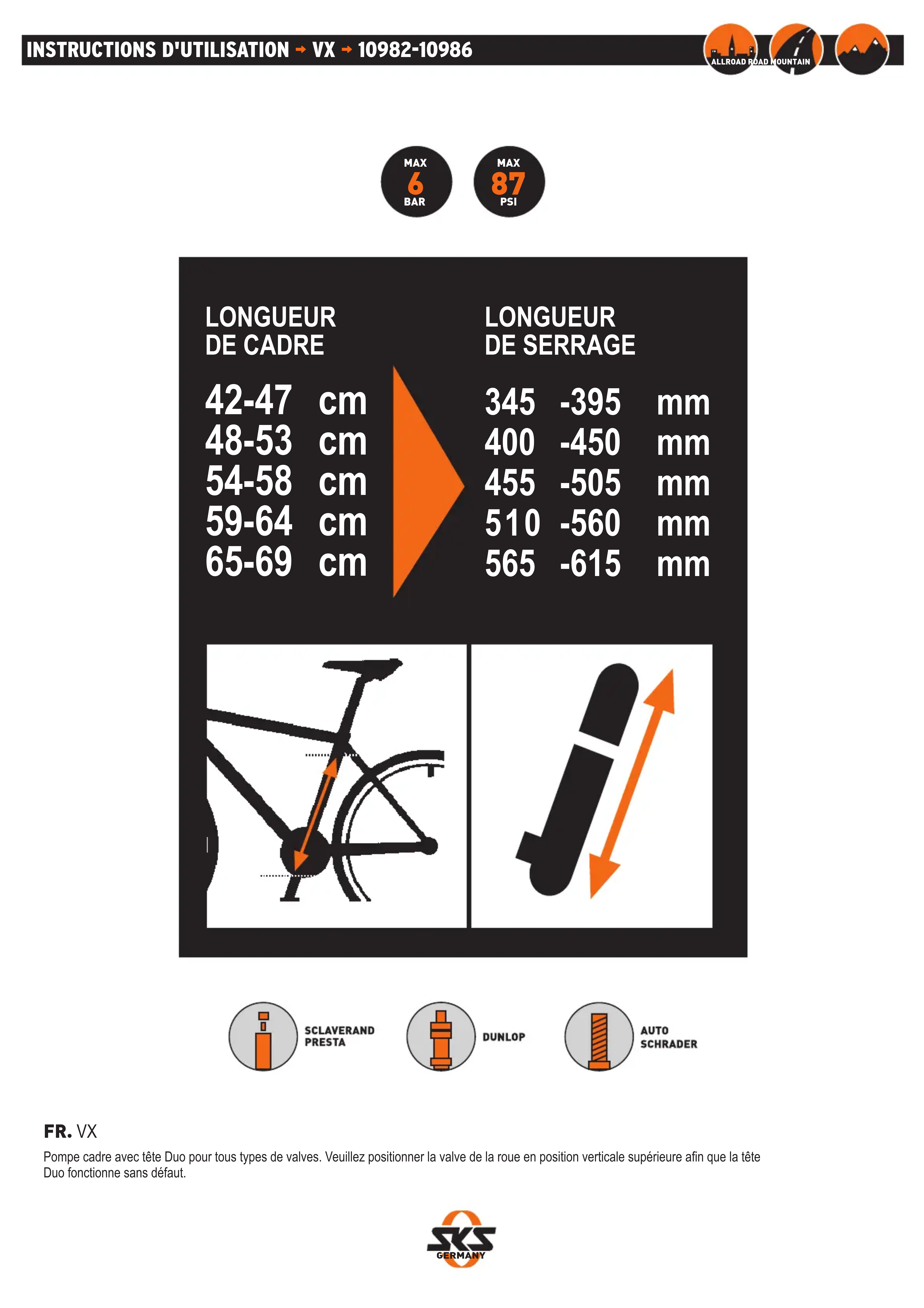 Pompe cadre avec tête Duo pour tous types de valves. Veuillez positionner la valve de la roue en position verticale supérieure an que la tête Duo fonctionne sans défaut. LONGUEUR DE CADRE 42-47 cm 48-53 cm 54-58 cm 59-64 cm 65-69 cm LONGUEUR DE SERRAGE 345 -395 mm 400 -450 mm 455 -505 mm 510 -560 mm 565 -615 mm