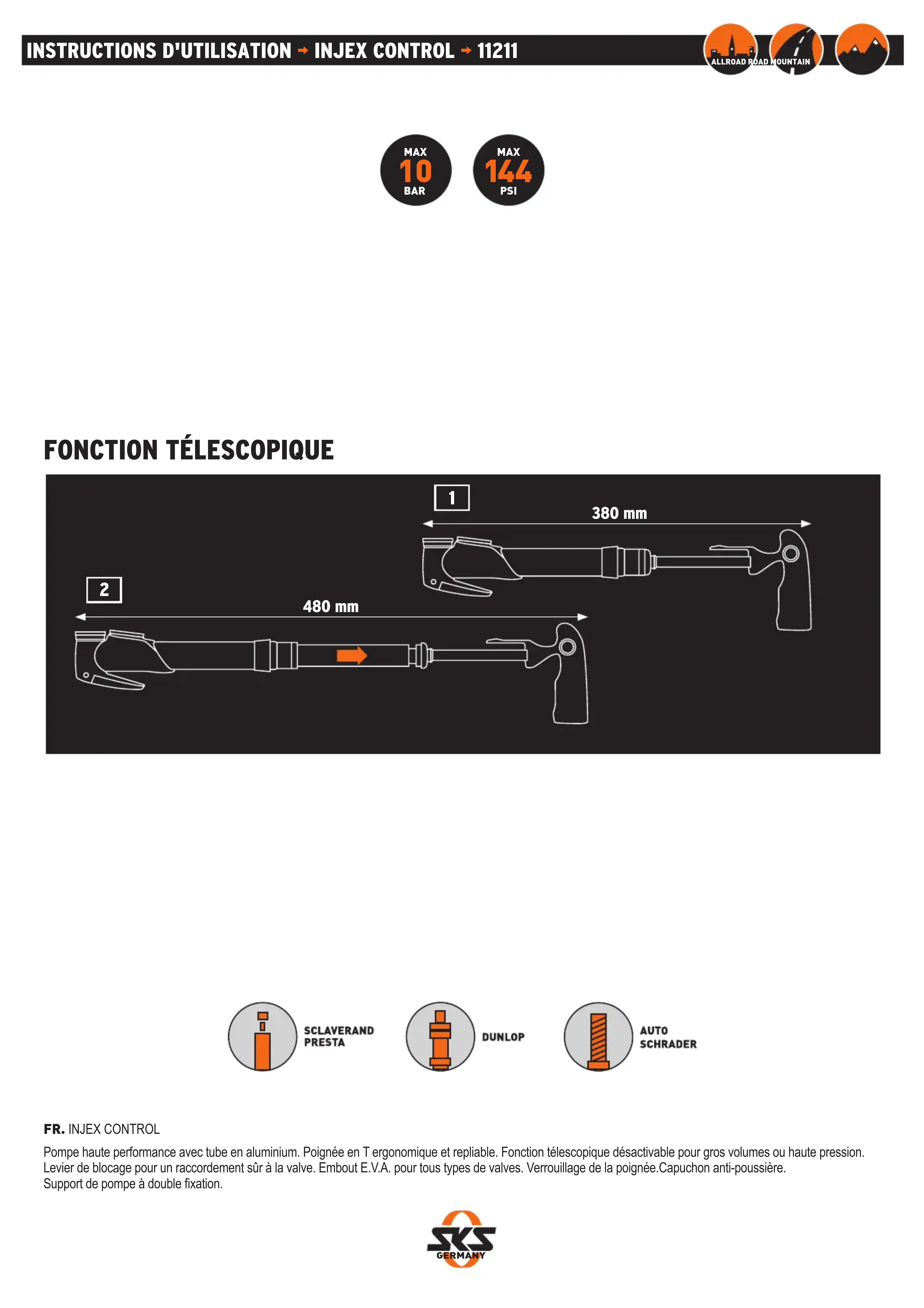 | Caractéristiques techniques | Pompe à vélo SKS Injex Control avec manomètre intégré, pression maximale de 8 bars, compatible avec les valves Presta et Schrader. |