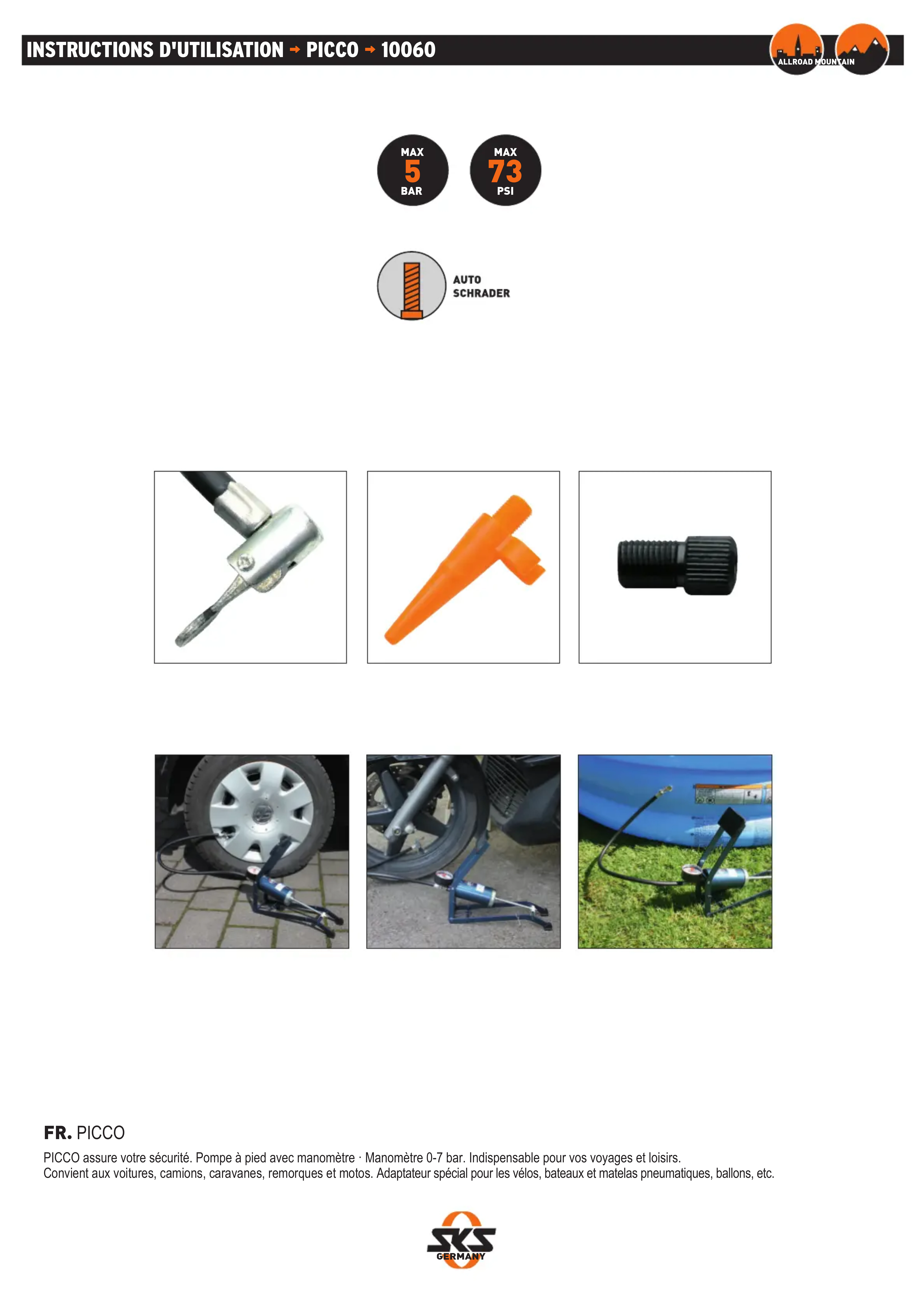 FR. PICCO PICCO assure votre sécurité. Pompe à pied avec manomètre · Manomètre 0-7 bar. Indispensable pour vos voyages et loisirs. Convient aux voitures, camions, caravanes, remorques et motos. Adaptateur spécial pour les vélos, bateaux et matelas pneumatiques, ballons, etc. ALLROAD MOUNTAIN