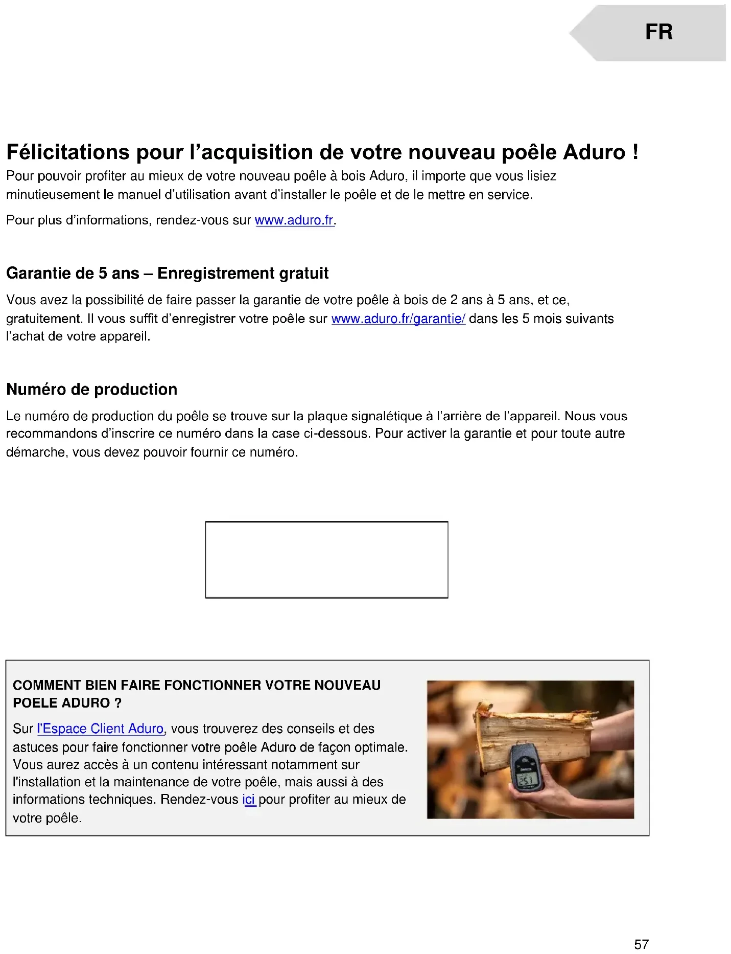 Félicitations pour l’acquisition de votre nouveau poêle Aduro ! Pour pouvoir profiter au mieux de votre nouveau poêle à bois Aduro, il importe que vous lisiez minutieusement le manuel d’utilisation avant d’installer le poêle et de le mettre en service. Pour plus d’informations, rendez-vous sur www.aduro.fr. Garantie de 5 ans – Enregistrement gratuit Vous avez la possibilité de faire passer la garantie de votre poêle à bois de 2 ans à 5 ans, et ce, gratuitement. Il vous suffit d’enregistrer votre poêle sur www.aduro.fr/garantie/ dans les 5 mois suivants l’achat de votre appareil. Numéro de production Le numéro de production du poêle se trouve sur la plaque signalétique à l’arrière de l’appareil. Nous vous recommandons d’inscrire ce numéro dans la case ci-dessous. Pour activer la garantie et pour toute autre démarche, vous devez pouvoir fournir ce numéro.