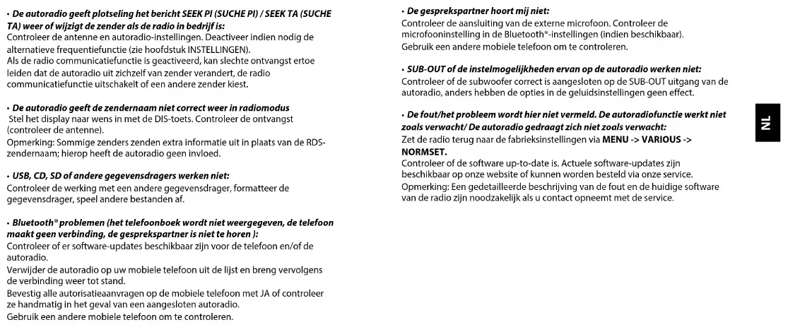 L’erreur/le problème n’est pas mentionné ici. La fonction système audio de voiture ne fonctionne pas comme prévu/ Le système audio de voiture ne se comporte pas comme prévu : Réinitialisez le système audio de voiture en configuration d’usine via MENU -> VARIOUS -> NORMSET. Vérifiez que le logiciel est à jour. Les mises à jour actuelles du logiciel sont disponibles sur notre site web ou peuvent être commandées par notre service de maintenance. Remarque : Une description détaillée du défaut et du logiciel actuel du système audio de voiture est nécessaire pour contacter le service de maintenance.ES