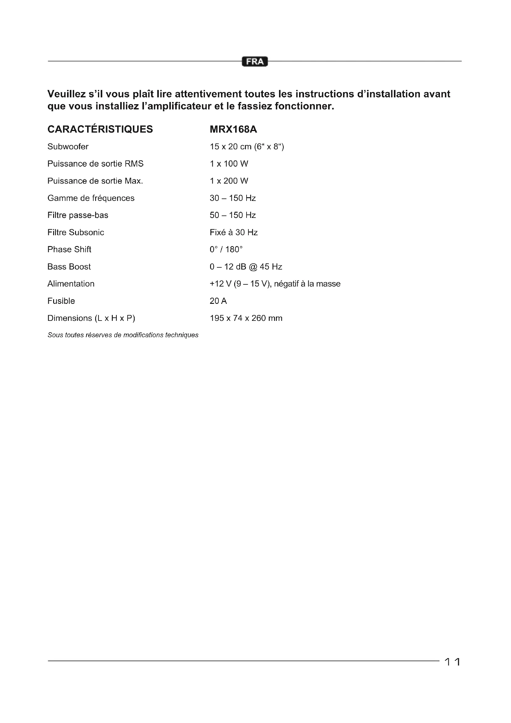 100 WATTS RMS / 200 WAT TS MAX. MRX168A11 Veuillez s’il vous plaît lire attentivement toutes les instructions d’installation avant que vous installiez l’amplicateur et le fassiez fonctionner. CARACTÉRISTIQUES Subwoofer Puissance de sortie RMS Puissance de sortie Max. Gamme de fréquences Filtre passe-bas Filtre Subsonic Phase Shift Bass Boost Alimentation Fusible Dimensions (L x H x P) 15 x 20 cm (6“ x 8“) 1 x 100 W 1 x 200 W 30 – 150 Hz 50 – 150 Hz Fixé à 30 Hz 0° / 180° 0 – 12 dB @ 45 Hz +12 V (9 – 15 V), négatif à la masse 20 A 195 x 74 x 260 mm Sous toutes réserves de modications techniques MRX168A12
