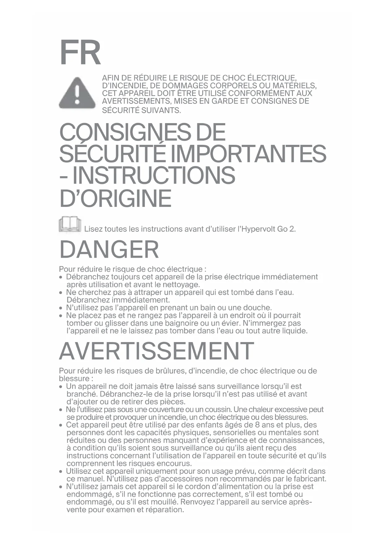 - INSTRUCTIONS D’ORIGINE Lisez toutes les instructions avant d’utiliser l’Hypervolt Go2. DANGER Pour réduire le risque de choc électrique: