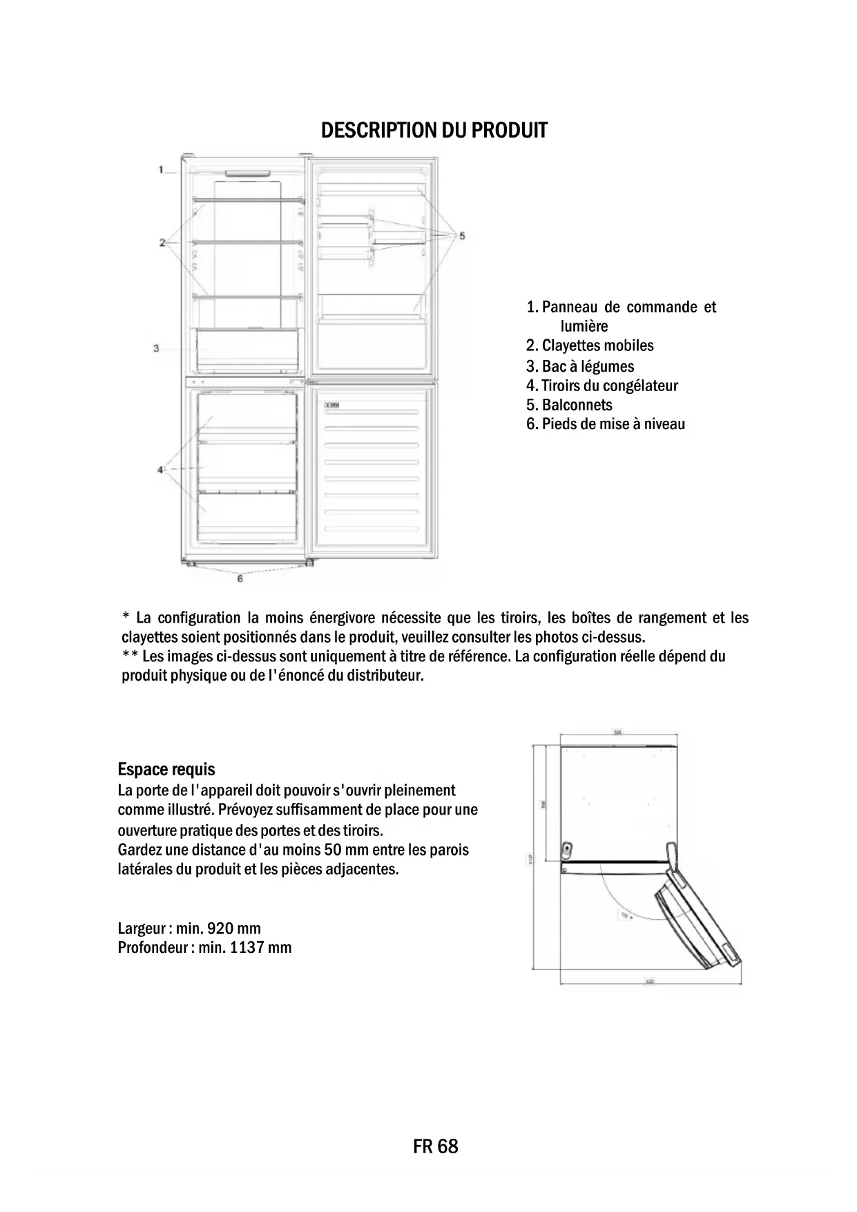 - La configuration la moins énergivore nécessite que les tiroirs, les boîtes de rangement et les clayettes soient positionnés dans le produit, veuillez consulter les photos ci-dessus. ** Les images ci-dessus sont uniquement à titre de référence. La configuration réelle dépend du produit physique ou de l'énoncé du distributeur. Espace requis La porte de l'appareil doit pouvoir s'ouvrir pleinement comme illustré. Prévoyez suffisamment de place pour une ouverture pratique des portes et des tiroirs. Gardez une distance d'au moins 50 mm entre les parois latérales du produit et les pièces adjacentes. Largeur : min. 920 mm Profondeur : min. 1137 mmFR 69 UTILISATION ➀ Touche Marche/Arrêt, utilisée pour allumer/éteindre l'appareil. ➁ Touche SET, utilisée pour sélectionner la température du réfrigérateur ou les fonctions spéciales comme. ➂ L’icône Wi-Fi indique si l’appareil est connecté à l’application. ➃ L'icône Super refroidissement indique si la fonction est activée. ➄ Niveaux de température, indiquant quelle est la température sélectionnée. Utilisation