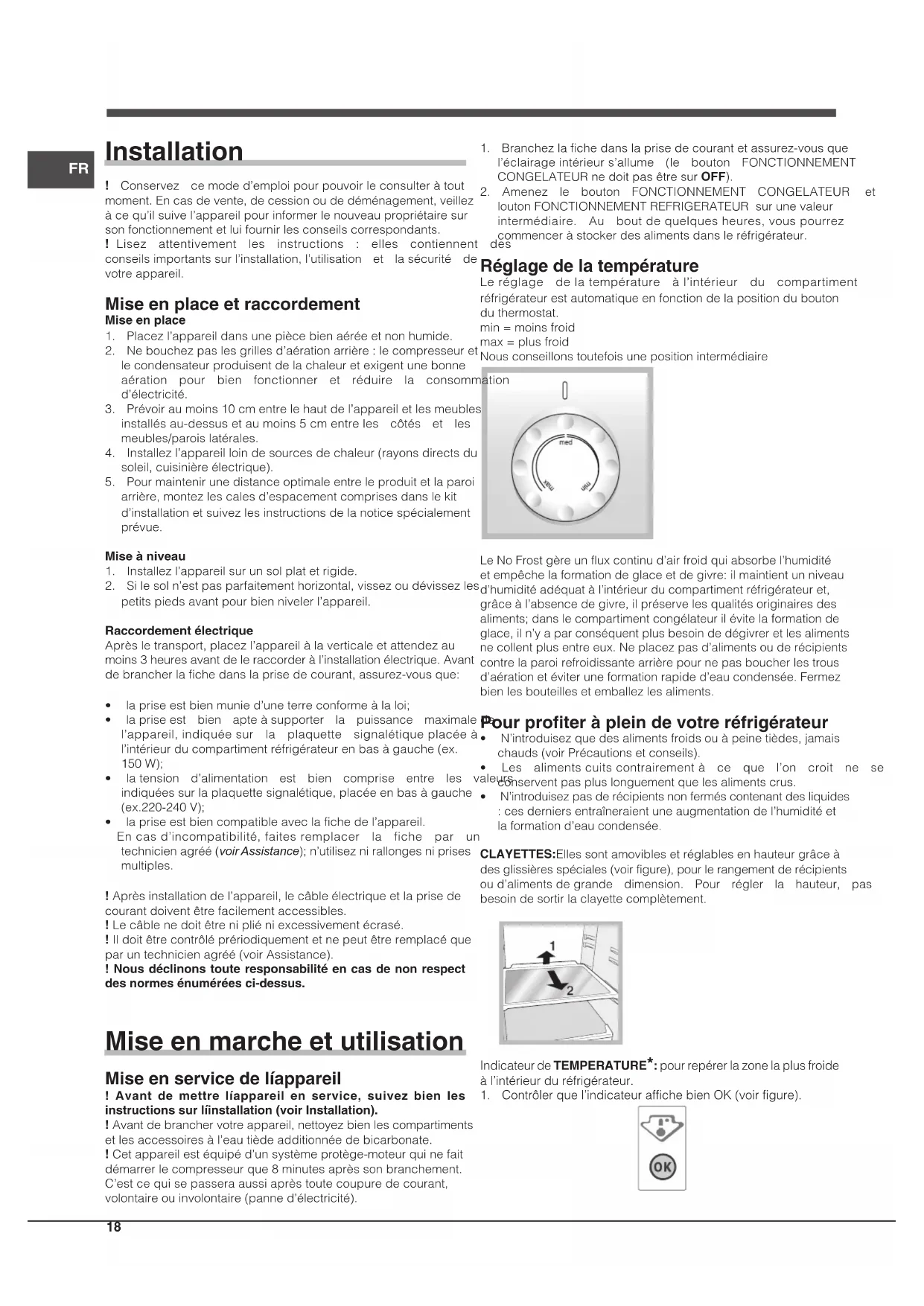 Installation ! Conservez cemoded’emploipourpouvoirleconsulteràtoutmoment.Encasdevente,decessionoudedéménagement,veillezàcequ’ilsuivel’appareilpourinformerlenouveaupropriétairesursonfonctionnementetluifournirlesconseilscorrespondants.! Lisez attentivement les instructions : elles contiennent desconseilsimportantssurl’installation,l’utilisation et lasécurité devotreappareil. Mise en place et raccordement Mise en place 1. Placezl’appareildansunepiècebienaéréeetnonhumide.2. Nebouchezpaslesgrillesd’aérationarrière:lecompresseuretlecondensateurproduisentdelachaleuretexigentunebonneaération pour bien fonctionner et réduire la consommationd’électricité.3. Prévoiraumoins10cmentrelehautdel’appareiletlesmeublesinstallésau-dessusetaumoins5cmentreles côtés et lesmeubles/paroislatérales.4. Installezl’appareilloindesourcesdechaleur(rayonsdirectsdusoleil,cuisinièreélectrique).5. Pourmaintenirunedistanceoptimaleentreleproduitetlaparoiarrière,montezlescalesd’espacementcomprisesdanslekitd’installationetsuivezlesinstructionsdelanoticespécialementprévue. Mise à niveau 1. Installezl’appareilsurunsolplatetrigide.2. Silesoln’estpasparfaitementhorizontal,vissezoudévissezlespetitspiedsavantpourbiennivelerl’appareil. Raccordement électrique Aprèsletransport,placezl’appareilàlaverticaleetattendezaumoins3heuresavantdeleraccorderàl’installationélectrique.Avantdebrancherlafichedanslaprisedecourant,assurez-vousque:• lapriseestbienmunied’uneterreconformeàlaloi;• lapriseest bien apteàsupporter la puissance maximaledel’appareil,indiquéesur la plaquette signalétiqueplacéeàl’intérieurducompartimentréfrigérateurenbasàgauche(ex.150W);• latension d’alimentation est bien comprise entre les valeursindiquéessurlaplaquettesignalétique,placéeenbasàgauche(ex.220-240V);• lapriseestbiencompatibleaveclafichedel’appareil. Encasd’incompatibilité,faitesremplacer la fiche par untechnicienagréé(voir Assistance);n’utiliseznirallongesniprisesmultiples.!Aprèsinstallationdel’appareil,lecâbleélectriqueetlaprisedecourantdoiventêtrefacilementaccessibles.!Lecâblenedoitêtrenipliéniexcessivementécrasé.! Ildoitêtrecontrôléprériodiquementetnepeutêtreremplacéqueparuntechnicienagréé(voirAssistance).! Nous déclinons toute responsabilité en cas de non respect des normes énumérées ci-dessus. Mise en marche et utilisation Mise en service de líappareil ! Avant de mettre líappareil en service, suivez bien les instructions sur líinstallation (voir Installation).!Avantdebranchervotreappareil,nettoyezbienlescompartimentsetlesaccessoiresàl’eautièdeadditionnéedebicarbonate.!Cetappareilestéquipéd’unsystèmeprotège-moteurquinefaitdémarrerlecompresseurque8minutesaprèssonbranchement.C’estcequisepasseraaussiaprèstoutecoupuredecourant,volontaireouinvolontaire(panned’électricité).1. Branchezlafichedanslaprisedecourantetassurez-vousquel’éclairageintérieurs’allume (le bouton FONCTIONNEMENTCONGELATEURnedoitpasêtresurOFF).2. Amenez le bouton FONCTIONNEMENT CONGELATEUR etloutonFONCTIONNEMENTREFRIGERATEURsurunevaleurintermédiaire. Au boutdequelquesheures,vouspourrezcommenceràstockerdesalimentsdansleréfrigérateur. Réglage de la température Leréglage delatempérature àl’intérieur du compartimentréfrigérateurestautomatiqueenfonctiondelapositionduboutonduthermostat.min=moinsfroidmax=plusfroidNousconseillonstoutefoisunepositionintermédiaireLeNoFrostgèreunfluxcontinud’airfroidquiabsorbel’humiditéetempêchelaformationdeglaceetdegivre:ilmaintientunniveaud’humiditéadéquatàl’intérieurducompartimentréfrigérateuret,grâceàl’absencedegivre,ilpréservelesqualitésoriginairesdesaliments;danslecompartimentcongélateurilévitelaformationdeglace,iln’yaparconséquentplusbesoindedégivreretlesalimentsnecollentplusentreeux. Neplacezpasd’alimentsouderécipientscontrelaparoirefroidissantearrièrepournepasboucherlestrousd’aérationetéviteruneformationrapided’eaucondensée.Fermezbienlesbouteillesetemballezlesaliments. Pour profiter à plein de votre réfrigérateur