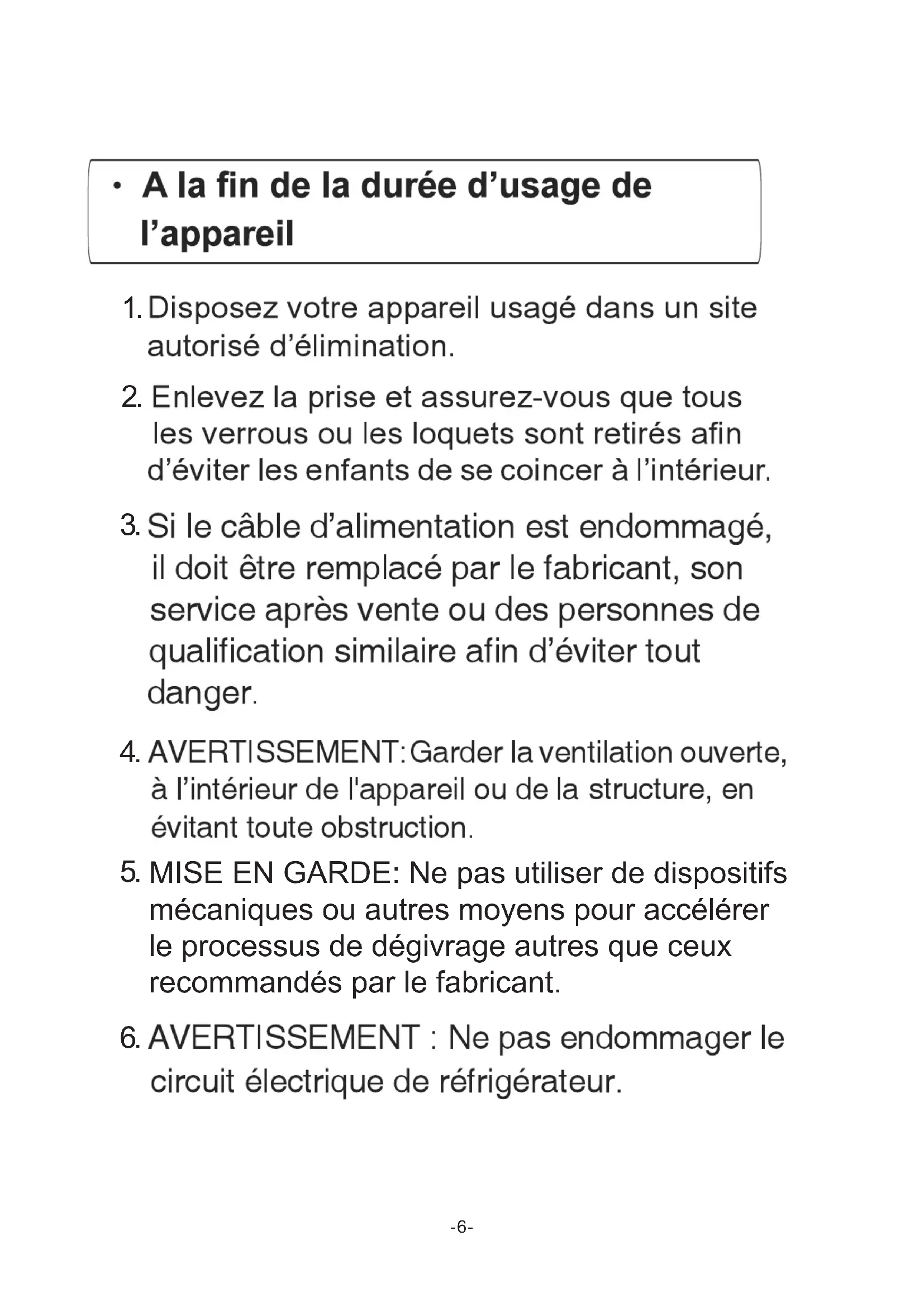 MISE EN GARDE: Ne pas utiliser de dispositifs mécaniques ou autres moyens pour accélérer le processus de dégivrage autres que ceux recommandés par le fabricant.Ne pas stocker dans cet appareil des substances explosives telles que des aérosols contenant des gaz propulseurs inflammables. En ce qui concerne les informations pour l'installation, la manipulation, l'entretien et la mise au rebut de l'appareil, référez- vous au paragraphe ci-après de la notice. Cet appareil est destiné à une utilisation domestique et analogue telles que: Les zones de cuisine du personnel de magasins, bureaux et autres environnements de travail; -Les fermes -Les clients dans les hôtels, motels et autres environnements de type résidentiel; -Environnements de type chambres d'hôtes;
