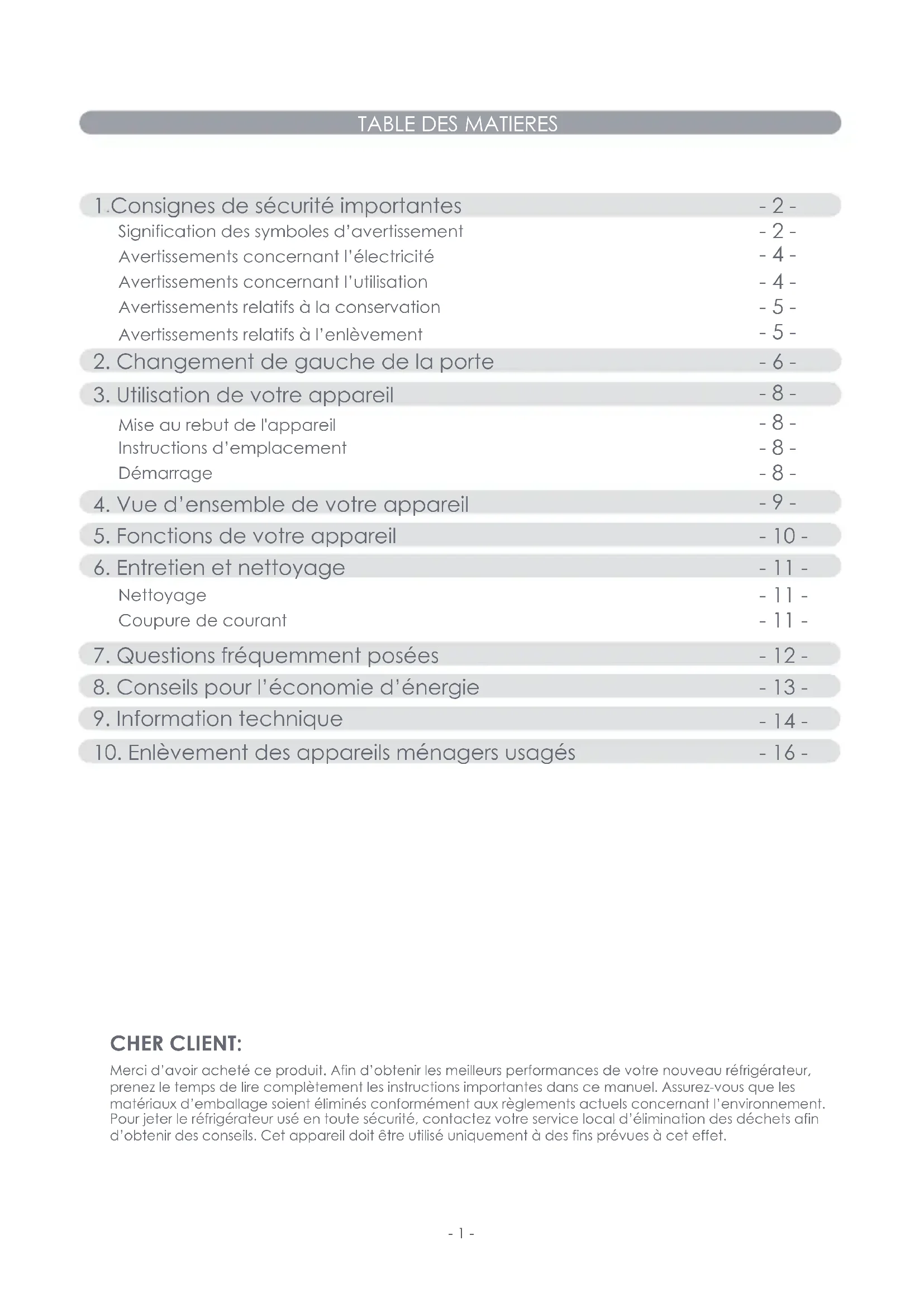 CHER CLIENT: Merci d’avoir acheté ce produit. Afin d’obtenir les meilleurs performances de votre nouveau réfrigérateur, prenez le temps de lire complètement les instructions importantes dans ce manuel. Assurez-vous que les matériaux d’emballage soient éliminés conformément aux règlements actuels concernant l’environnement. Pour jeter le réfrigérateur usé en toute sécurité, contactez votre service local d’élimination des déchets afin d’obtenir des conseils. Cet appareil doit être utilisé uniquement à des fins prévues à cet effet.