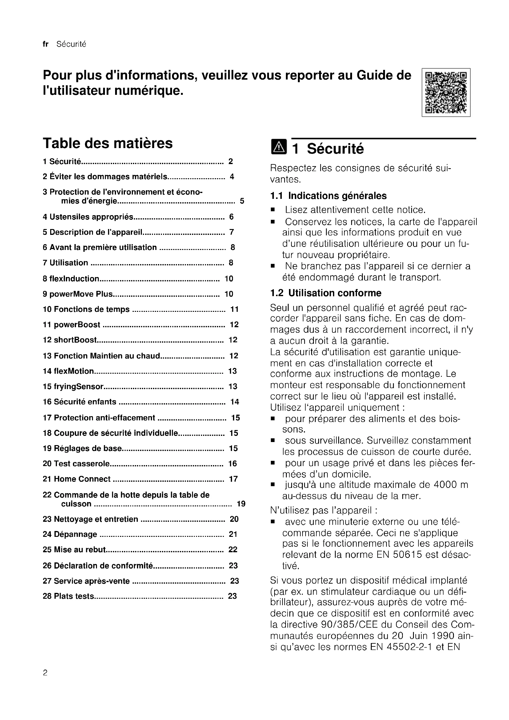 - 28 Plats tests 1 Sécurité Respectez les consignes de sécurité sui- vantes. 1.1 Indications générales ¡ Lisez attentivement cette notice. ¡ Conservez les notices, la carte de l'appareil ainsi que les informations produit en vue d’une réutilisation ultérieure ou pour un fu- tur nouveau propriétaire. ¡ Ne branchez pas l’appareil si ce dernier a été endommagé durant le transport. 1.2 Utilisation conforme Seul un personnel qualifié et agréé peut rac- corder l'appareil sans fiche. En cas de dom- mages dus à un raccordement incorrect, il n'y a aucun droit à la garantie. La sécurité d'utilisation est garantie unique- ment en cas d'installation correcte et conforme aux instructions de montage. Le monteur est responsable du fonctionnement correct sur le lieu où l'appareil est installé. Utilisez l‘appareil uniquement: ¡ pour préparer des aliments et des bois- sons. ¡ sous surveillance. Surveillez constamment les processus de cuisson de courte durée. ¡ pour un usage privé et dans les pièces fer- mées d’un domicile. ¡ jusqu'à une altitude maximale de 4000m au-dessus du niveau de la mer. N’utilisez pas l’appareil: ¡ avec une minuterie externe ou une télé- commande séparée. Ceci ne s'applique pas si le fonctionnement avec les appareils relevant de la norme EN 50615 est désac- tivé. Si vous portez un dispositif médical implanté (par ex. un stimulateur cardiaque ou un défi- brillateur), assurez-vous auprès de votre mé- decin que ce dispositif est en conformité avec la directive 90/385/CEE du Conseil des Com- munautés européennes du 20 Juin 1990 ain- si qu’avec les normes EN 45502-2-1 et ENSécurité fr p. 23