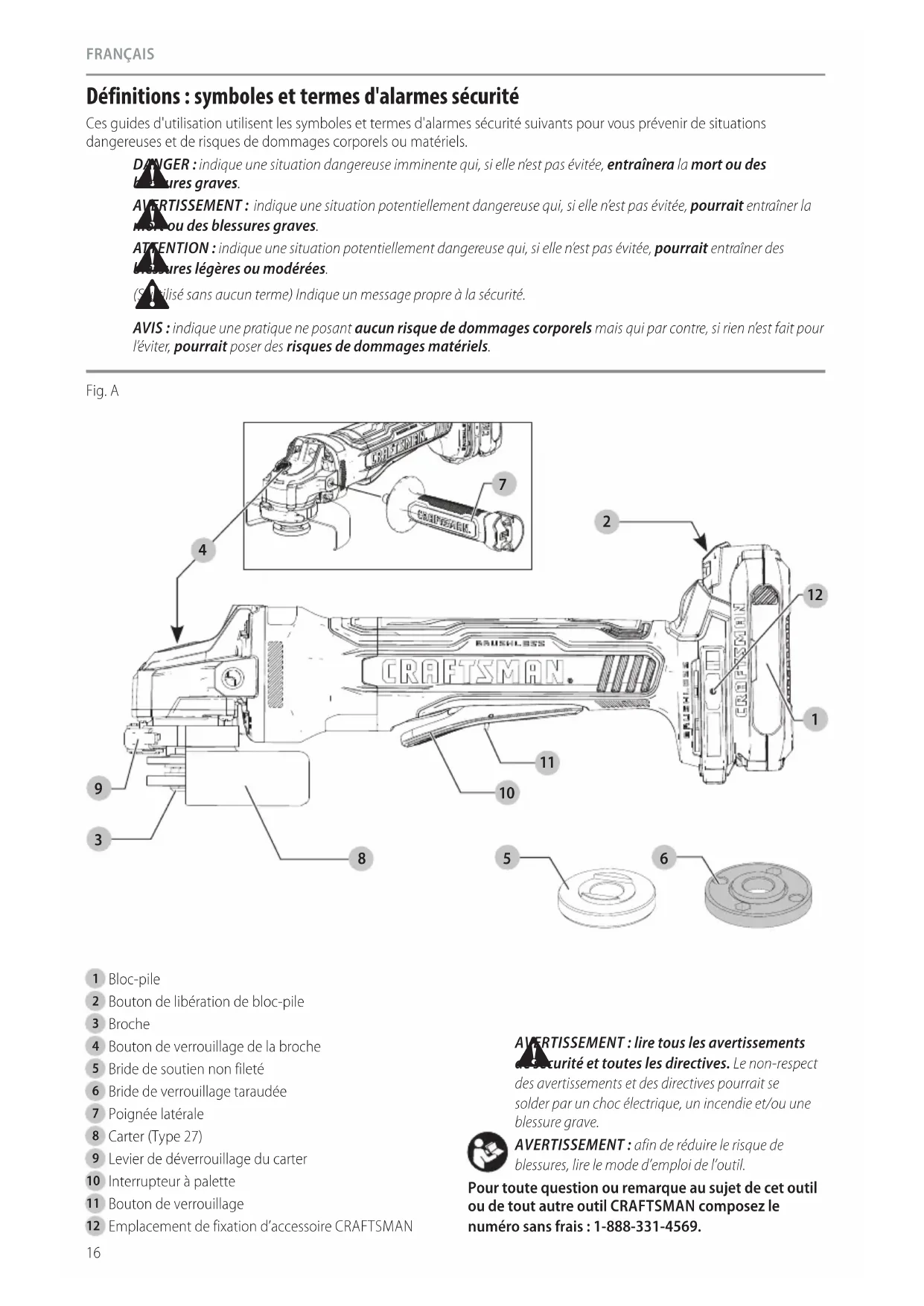 blessures, lire le mode d’emploi del’outil. Pour toute question ou remarque au sujet de cet outil ou de tout autre outil CRAFTSMAN composez le numéro sans frais : 1-888-331-4569. Fig. A