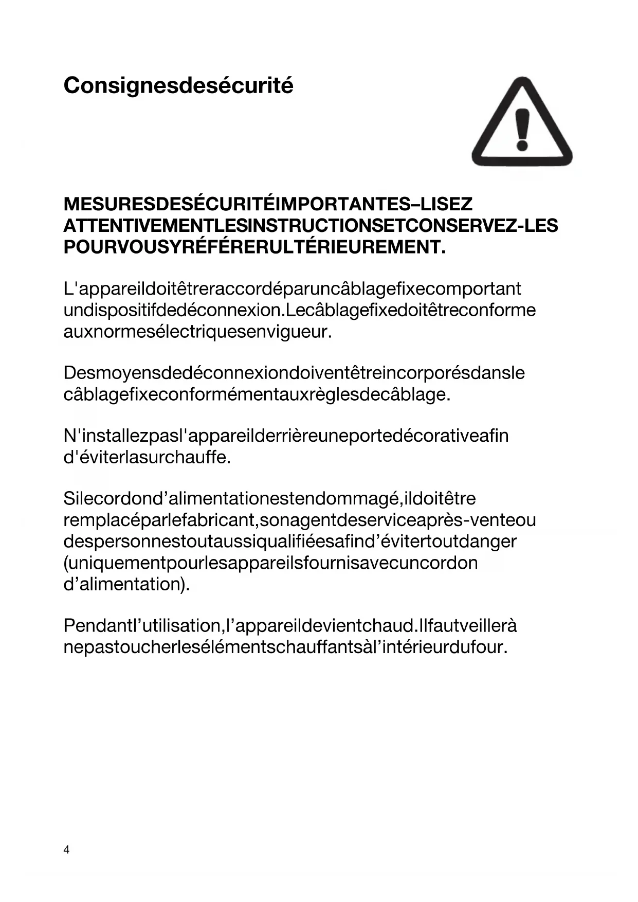 POUR VOUS Y RÉFÉRER ULTÉRIEUREMENT. L'appareil doit être raccordé par un câblage fixe comportant un dispositif de déconnexion. Le câblage fixe doit être conforme aux normes électriques en vigueur. Des moyens de déconnexion doivent être incorporés dans le câblage fixe conformément aux règles de câblage. N'installez pas l'appareil derrière une porte décorative afin d'éviter la surchauffe. Si le cordon d’alimentation est endommagé, il doit être remplacé par le fabricant, son agent de service après-vente ou des personnes tout aussi qualifiées afin d’éviter tout danger (uniquement pour les appareils fournis avec un cordon d’alimentation). Pendant l’utilisation, l’appareil devient chaud. Il faut veiller à ne pas toucher les éléments chauffants à l’intérieur du four. 4Cet appareil peut être utilisé par des enfants âgés de 8 ans et plus, et par des personnes aux capacités physiques, sensorielles ou mentales réduites ou manquant d’expérience et de connaissances, si elles ont été supervisées ou ont reçu des instructions concernant l’utilisation de l’appareil en toute sécurité, et si elles comprennent les risques encourus. Les enfants ne doivent pas jouer avec l’appareil. Le nettoyage et l’entretien de l’appareil par l’utilisateur ne doivent pas être effectués par des enfants sans surveillance.