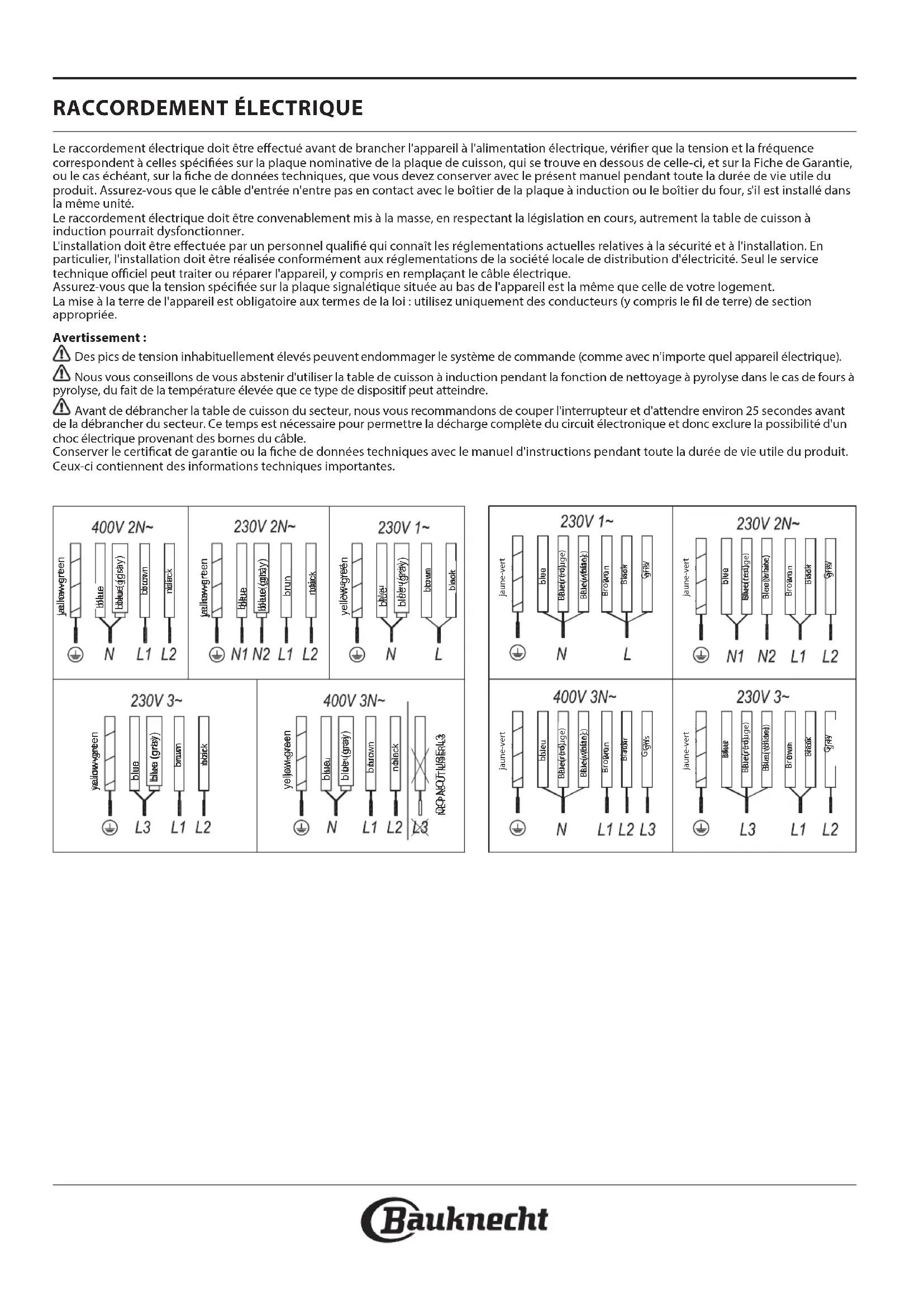 Des pics de tension inhabituellement élevés peuvent endommager le système de commande (comme avec n'importe quel appareil électrique). Nous vous conseillons de vous abstenir d'utiliser la table de cuisson à induction pendant la fonction de nettoyage à pyrolyse dans le cas de fours à pyrolyse, du fait de la température élevée que ce type de dispositif peut atteindre. Avant de débrancher la table de cuisson du secteur, nous vous recommandons de couper l'interrupteur et d'attendre environ 25 secondes avant de la débrancher du secteur. Ce temps est nécessaire pour permettre la décharge complète du circuit électronique et donc exclure la possibilité d'un choc électrique provenant des bornes du câble. Conserver le certicat de garantie ou la che de données techniques avec le manuel d'instructions pendant toute la durée de vie utile du produit. Ceux-ci contiennent des informations techniques importantes. yellow-green blue blue (gray) brownblack