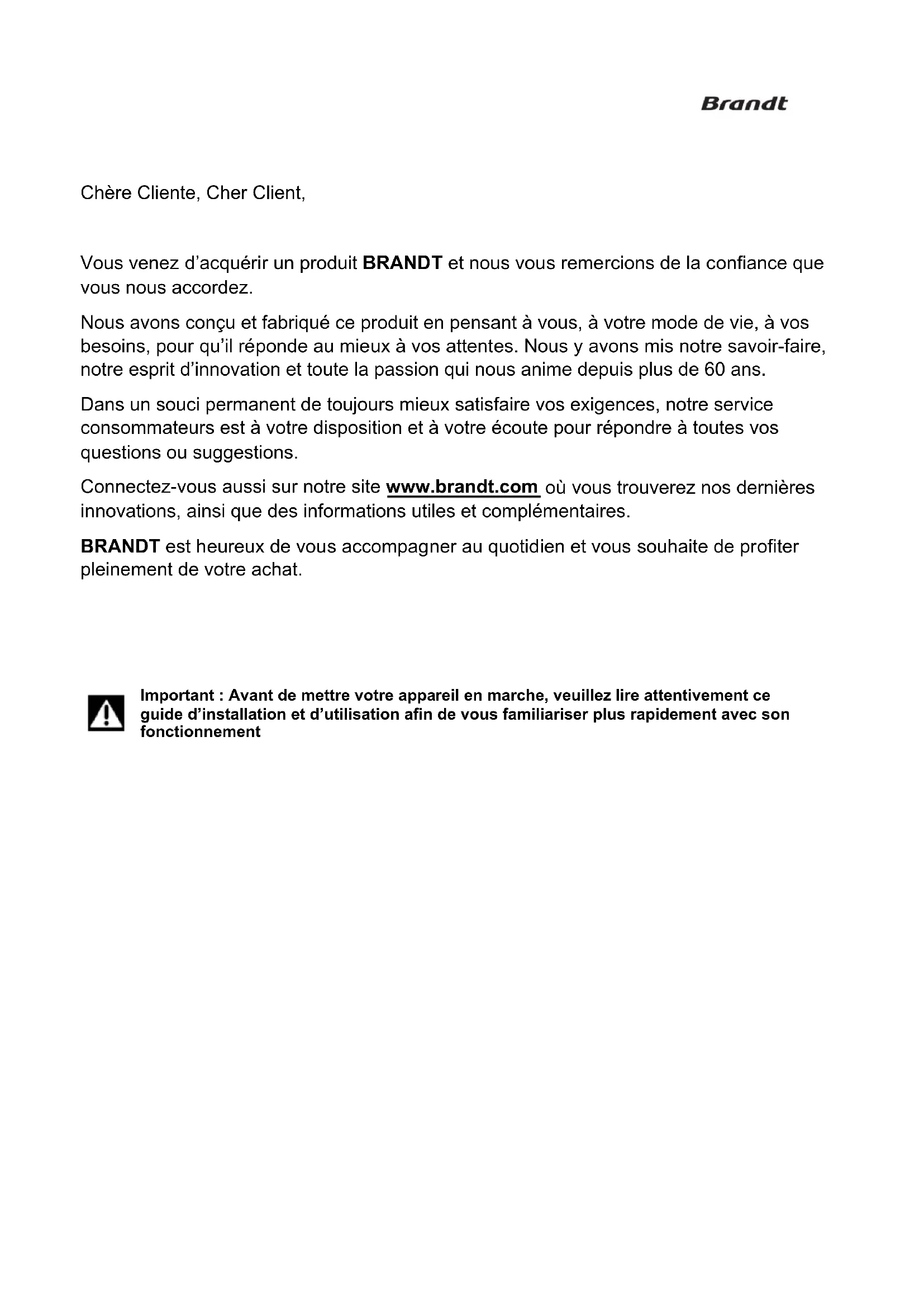 Consulter notre site : www.brandt.fr Nous écrire à l’adresse postale suivante : Service Consommateurs BRANDT 5 Avenue des Béthunes