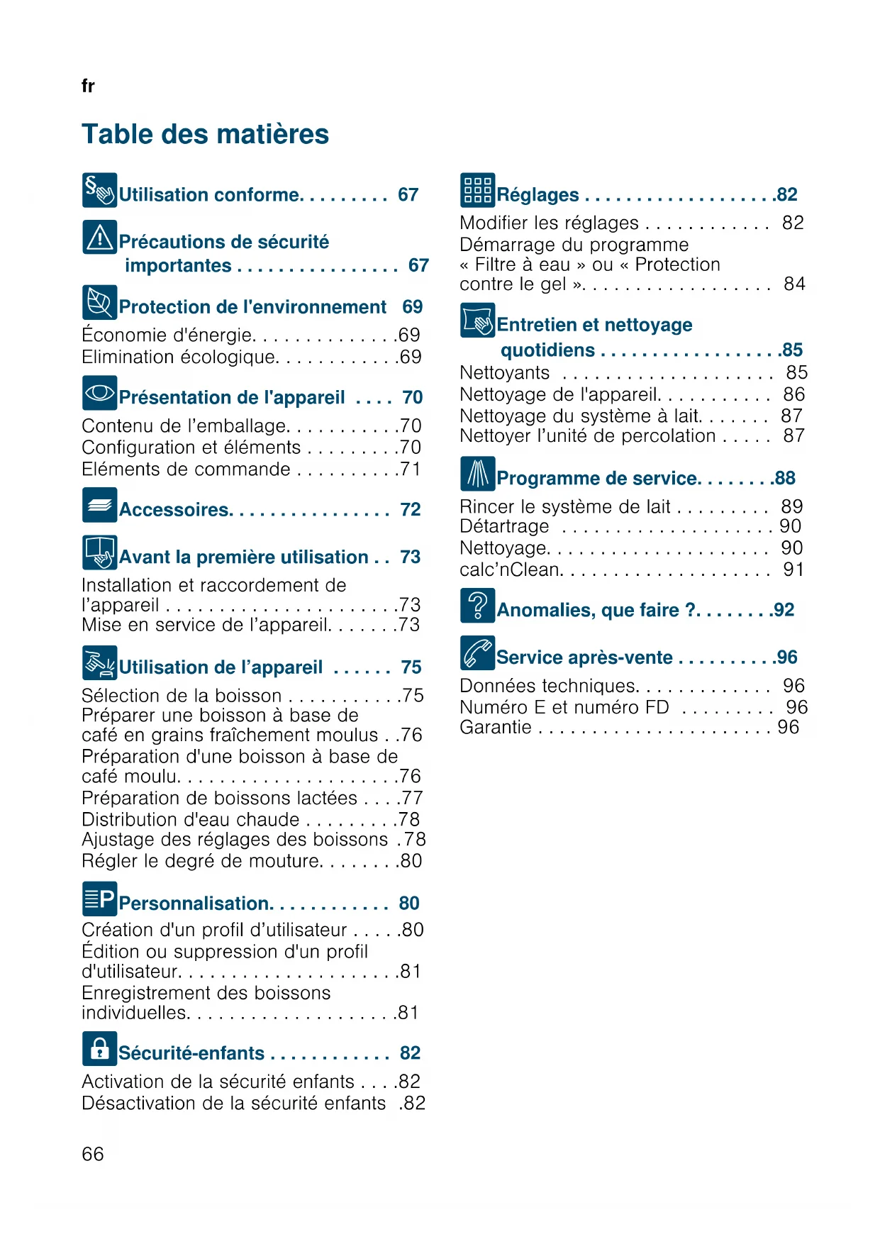 | Impossible derirrer la cuvette d'égoutage. | Le bac à marc de café est extrê- mement plein. Le racleur deMarc de café est coince. | Nettoyer l'intérieur de l'unité de perco- lation. → "Nettoyage de l'appareil" à la page 86 Positionner correctement le racleur de marc de café. |