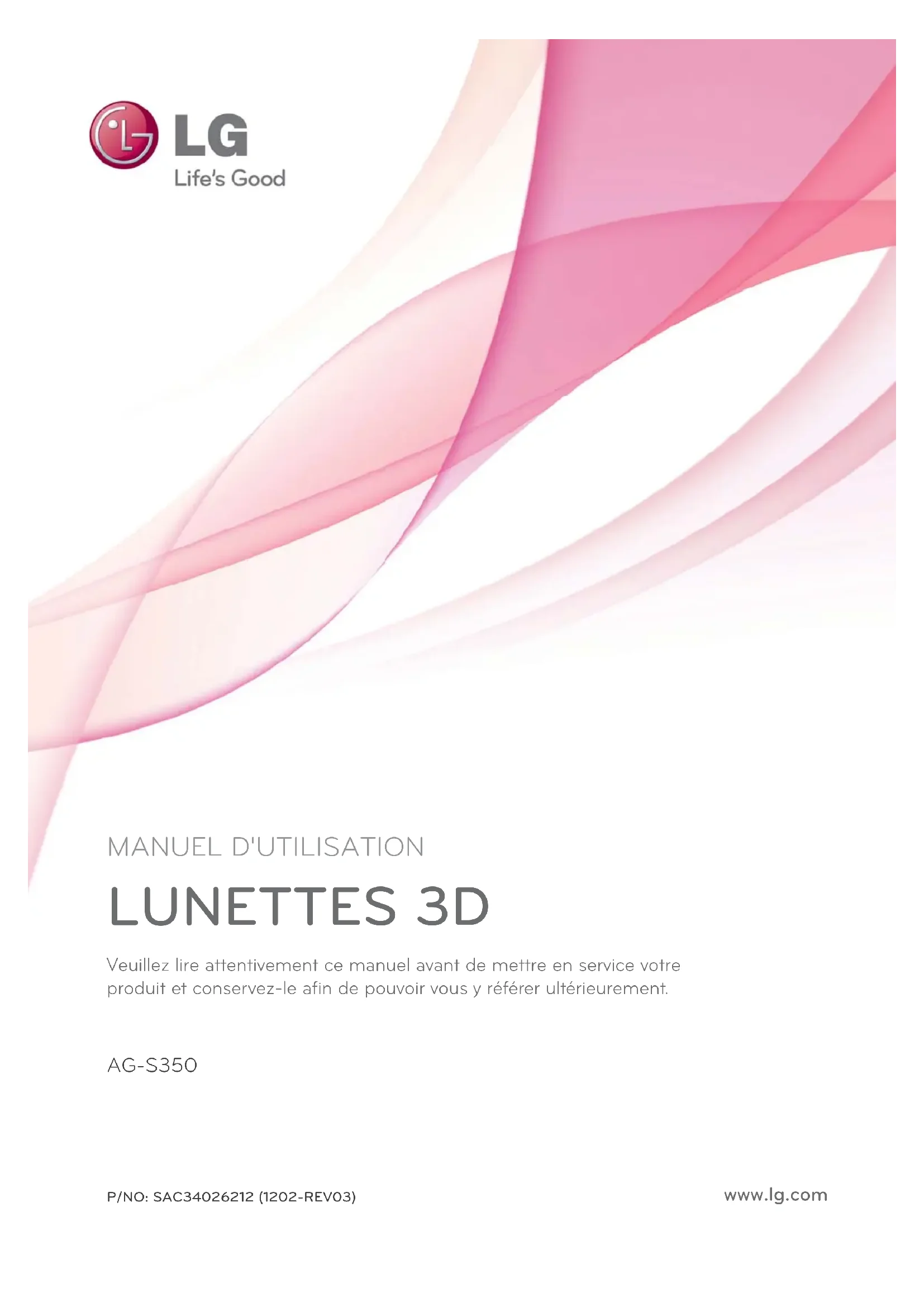 MANUEL D'UTILISATION Veuillez lire attentivement ce manuel avant de mettre en service votre produit et conservez-le afi n de pouvoir vous y référer ultérieurement. www.lg.com LUNETTES3D AG-S350