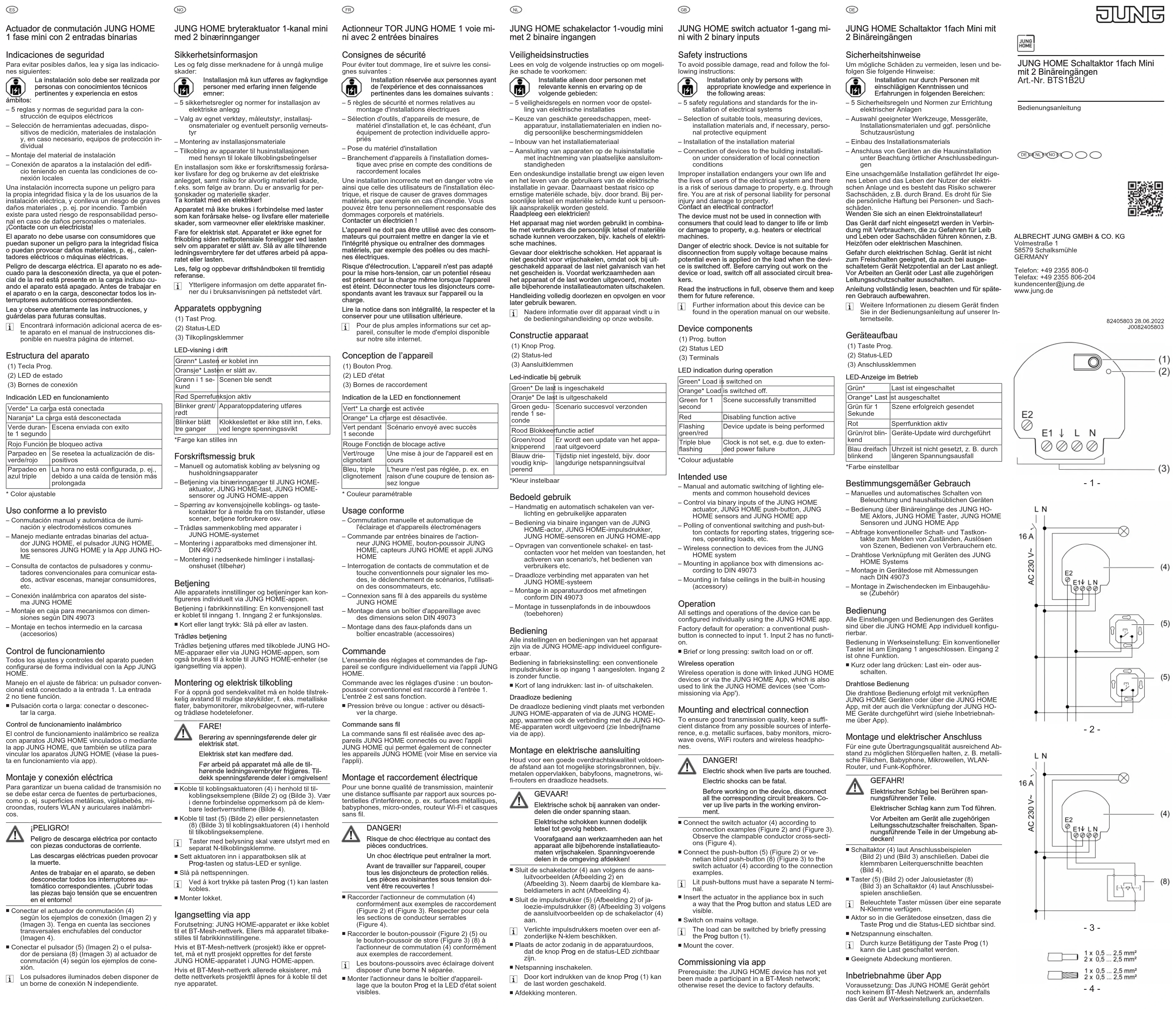 Actionneur TOR JUNG HOME 1 voie mi- ni avec 2 entrées binaires Consignes de sécurité Pour éviter tout dommage, lire et suivre les consi- gnes suivantes: Installation réservée aux personnes ayant de l'expérience et des connaissances pertinentes dans les domaines suivants: – 5 règles de sécurité et normes relatives au montage d'installations électriques – Sélection d'outils, d'appareils de mesure, de matériel d'installation et, le cas échéant, d'un équipement de protection individuelle appro- priés – Pose du matériel d'installation – Branchement d'appareils à l'installation domes- tique avec prise en compte des conditions de raccordement locales Une installation incorrecte met en danger votre vie ainsi que celle des utilisateurs de l'installation élec- trique, et risque de causer de graves dommages matériels, par exemple en cas d'incendie. Vous pouvez être tenu personnellement responsable des dommages corporels et matériels. Contacter un électricien! L'appareil ne doit pas être utilisé avec des consom- mateurs qui pourraient mettre en danger la vie et l'intégrité physique ou entraîner des dommages matériels, par exemple des poêles ou des machi- nes électriques. Risque d'électrocution. L'appareil n'est pas adapté pour la mise hors-tension, car un potentiel réseau est présent sur la charge même lorsque l'appareil est éteint. Déconnecter tous les disjoncteurs corre- spondants avant les travaux sur l'appareil ou la charge. Lire la notice dans son intégralité, la respecter et la conserver pour une utilisation ultérieure. Pour de plus amples informations sur cet ap- pareil, consulter le mode d'emploi disponible sur notre site internet. Conception de l’appareil (1) Bouton Prog. (2) LED d'état (3) Bornes de raccordement Indication de la LED en fonctionnement Vert* La charge est activée Orange* La charge est désactivée. Vert pendant 1 seconde Scénario envoyé avec succès Rouge Fonction de blocage active Vert/rouge clignotant Une mise à jour de l'appareil est en cours Bleu, triple clignotement L'heure n'est pas réglée, p. ex. en raison d'une coupure de tension as- sez longue *Couleur paramétrable Usage conforme – Commutation manuelle et automatique de l'éclairage et d'appareils électroménagers – Commande par entrées binaires de l'action- neur JUNG HOME, bouton-poussoir JUNG HOME, capteurs JUNG HOME et appli JUNG HOME – Interrogation de contacts de commutation et de touche conventionnels pour signaler les mo- des, le déclenchement de scénarios, l'utilisati- on des consommateurs, etc. – Connexion sans fil à des appareils du système JUNG HOME – Montage dans un boîtier d'appareillage avec des dimensions selon DIN 49073 – Montage dans des faux-plafonds dans un boîtier encastrable (accessoires) Commande L'ensemble des réglages et commandes de l'ap- pareil se configure individuellement via l'appli JUNG HOME. Commande avec les réglages d'usine: un bouton- poussoir conventionnel est raccordé à l'entrée 1. L'entrée 2 est sans fonction. ■ Pression brève ou longue: activer ou désacti- ver la charge. Commande sans fil La commande sans fil est réalisée avec des ap- pareils JUNG HOME connectés ou avec l'appli JUNG HOME qui permet également de connecter les appareils JUNG HOME (voir Mise en service via l'appli). Montage et raccordement électrique Pour une bonne qualité de transmission, maintenir une distance suffisante par rapport aux sources po- tentielles d'interférence, p. ex. surfaces métalliques, babyphones, micro-ondes, routeur Wi-Fi et casques sans fil. DANGER! Risque de choc électrique au contact des pièces conductrices. Un choc électrique peut entraîner la mort. Avant de travailler sur l'appareil, couper tous les disjoncteurs de protection reliés. Les pièces avoisinantes sous tension doi- vent être recouvertes! ■ Raccorder l'actionneur de commutation (4) conformément aux exemples de raccordement (Figure 2) et (Figure 3). Respecter pour cela les sections de conducteur serrables (Figure 4). ■ Raccorder le bouton-poussoir (Figure 2) (5) ou le bouton-poussoir de store (Figure 3) (8) à l'actionneur de commutation (4) conformément aux exemples de raccordement. Les boutons-poussoirs avec éclairage doivent disposer d'une borne N séparée. ■ Monter l'actionneur dans le boîtier d'appareil- lage que la bouton Prog et la LED d'état soient visibles.
