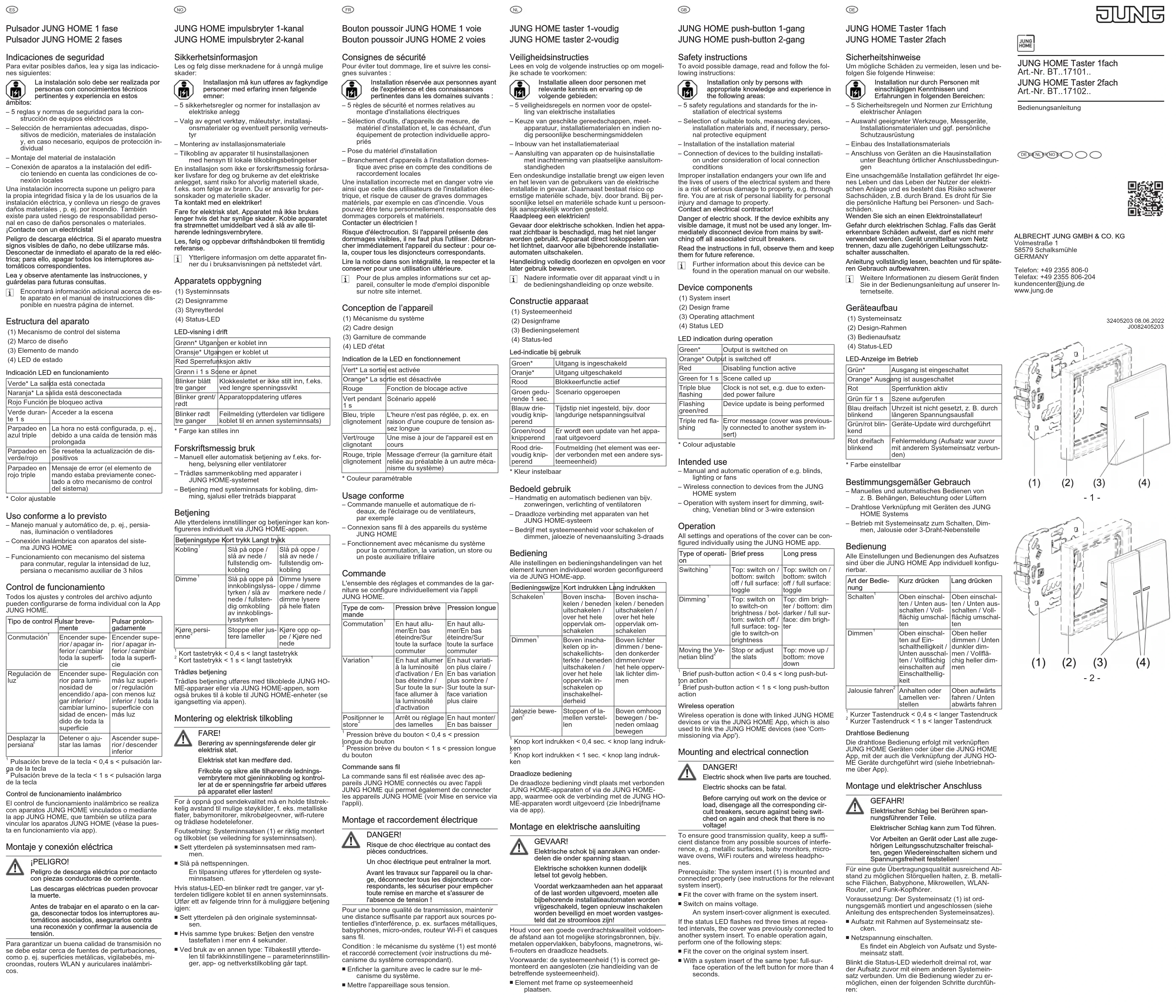 Bouton poussoir JUNG HOME 1 voie Bouton poussoir JUNG HOME 2 voies Consignes de sécurité Pour éviter tout dommage, lire et suivre les consi- gnes suivantes: Installation réservée aux personnes ayant de l'expérience et des connaissances pertinentes dans les domaines suivants: – 5 règles de sécurité et normes relatives au montage d'installations électriques – Sélection d'outils, d'appareils de mesure, de matériel d'installation et, le cas échéant, d'un équipement de protection individuelle appro- priés – Pose du matériel d'installation – Branchement d'appareils à l'installation domes- tique avec prise en compte des conditions de raccordement locales Une installation incorrecte met en danger votre vie ainsi que celle des utilisateurs de l'installation élec- trique, et risque de causer de graves dommages matériels, par exemple en cas d'incendie. Vous pouvez être tenu personnellement responsable des dommages corporels et matériels. Contacter un électricien! Risque d'électrocution. Si l'appareil présente des dommages visibles, il ne faut plus l'utiliser. Débran- cher immédiatement l'appareil du secteur: pour ce- la, couper tous les disjoncteurs correspondants. Lire la notice dans son intégralité, la respecter et la conserver pour une utilisation ultérieure. Pour de plus amples informations sur cet ap- pareil, consulter le mode d'emploi disponible sur notre site internet. Conception de l’appareil (1) Mécanisme du système (2) Cadre design (3) Garniture de commande (4) LED d'état Indication de la LED en fonctionnement Vert* La sortie est activée Orange* La sortie est désactivée Rouge Fonction de blocage active Vert pendant