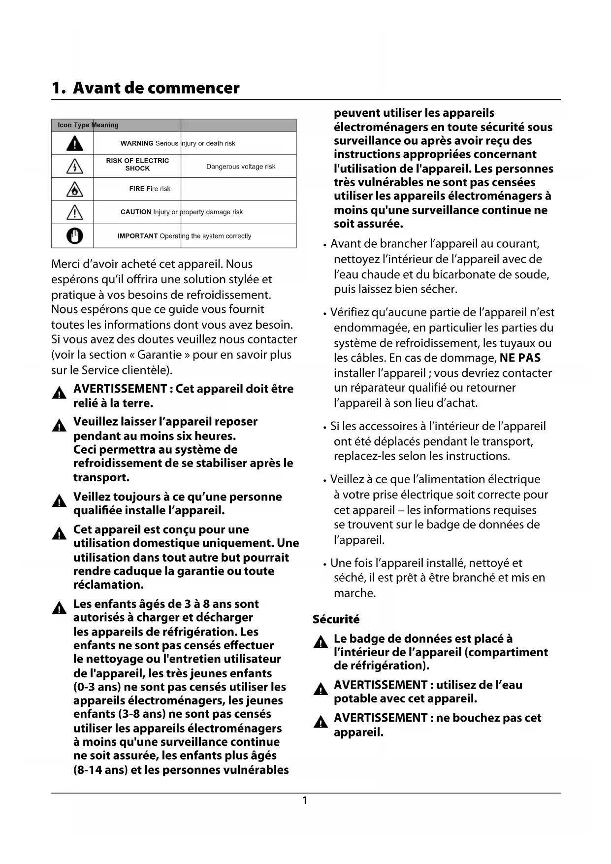 - Une fois l’appareil installé, nettoyé et séché, il est prêt à être branché et mis en marche. Sécurité