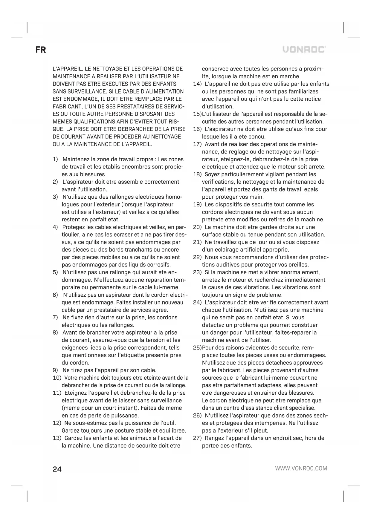 - Des pièces détachées non d’origine ont été utilisées. Ceci constitue l’unique garantie accordée par la société explicitement ou implicitement. Il n’existe aucune autre garantie, explicite ou implicite, qui peut s’étendre au delà du contenu ici présent, y compris les garanties marchandes ou d’adaptation à des fins particulières. En aucun cas VONROC ne sera tenu responsable de dommages accidentels ou consécutifs. Les solutions proposées par les reven- deurs devront se limiter à la réparation ou le rempla- cement des éléments ou pièces non conformes. Le produit et le manuel d’utilisation sont sujets à modifications. Les spécifications peuvent changer sans préavis.30