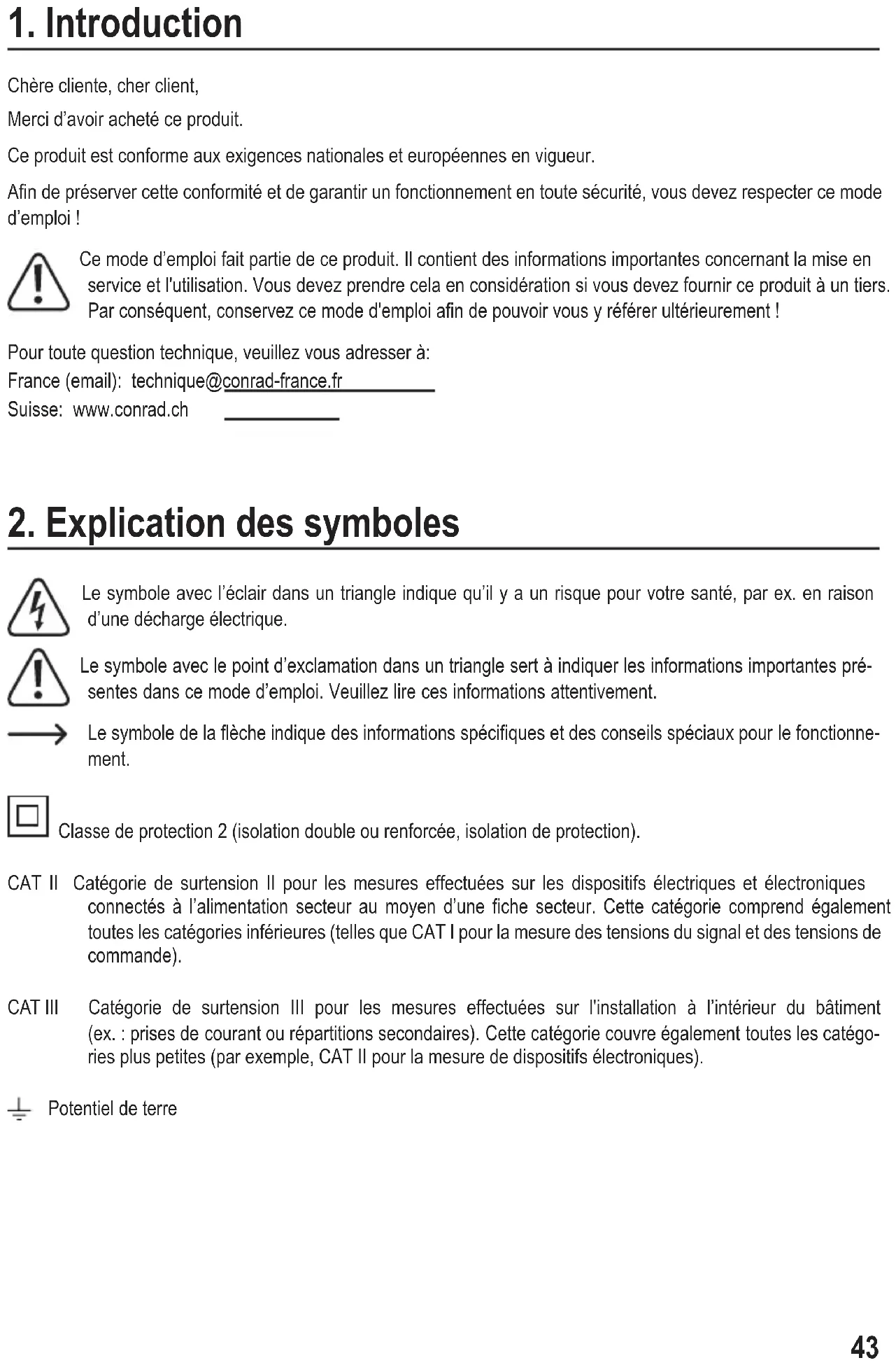 Le symbole avec l’éclair dans un triangle indique qu’il y a un risque pour votre santé, par ex. en raison d’une décharge électrique. Le symbole avec le point d’exclamation dans un triangle sert à indiquer les informations importantes pré- sentes dans ce mode d’emploi. Veuillez lire ces informations attentivement. Le symbole de la èche indique des informations spéciques et des conseils spéciaux pour le fonctionne- ment. Classe de protection 2 (isolation double ou renforcée, isolation de protection). CAT II Catégorie de surtension II pour les mesures effectuées sur les dispositifs électriques et électroniques connectés à l’alimentation secteur au moyen d’une che secteur. Cette catégorie comprend également toutes les catégories inférieures (telles que CAT I pour la mesure des tensions du signal et des tensions de commande). CAT III Catégorie de surtension III pour les mesures effectuées sur l'installation à l’intérieur du bâtiment (ex. : prises de courant ou répartitions secondaires). Cette catégorie couvre également toutes les catégo- ries plus petites (par exemple, CAT II pour la mesure de dispositifs électroniques). Potentiel de terre44